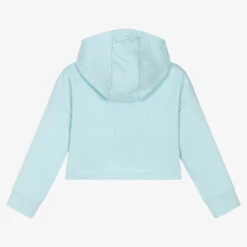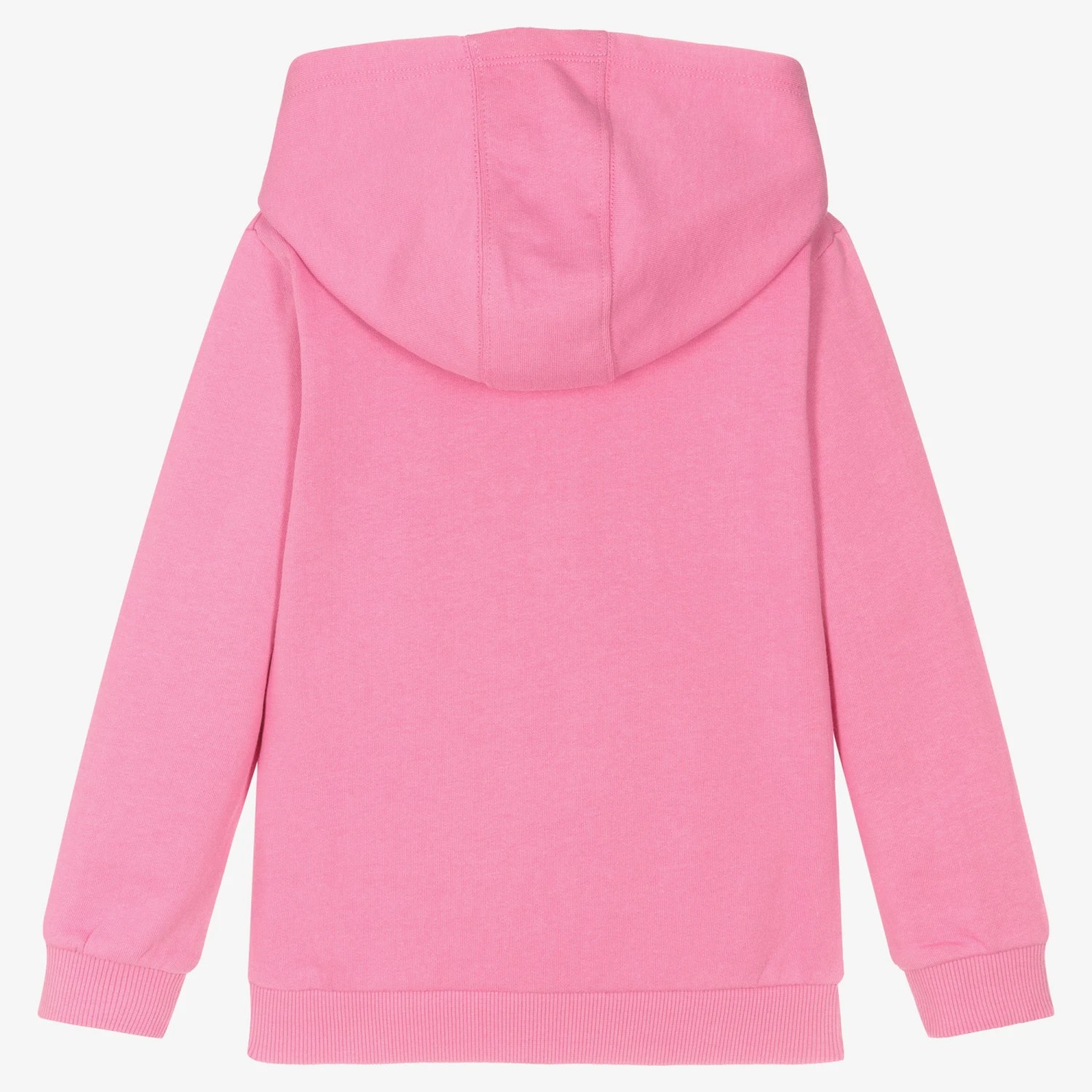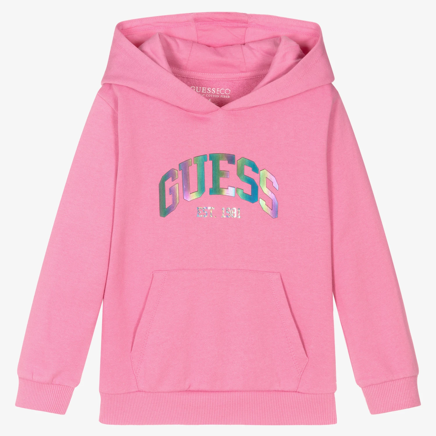 Pale pink hooded cotton top for little girls by Guess, made in mid-weight jersey. The front has an iridescent logo appliqué on the front, with a useful pouch pocket and cosy ribbed cuffs and hem. This hoodie contains organic cotton fibre.
