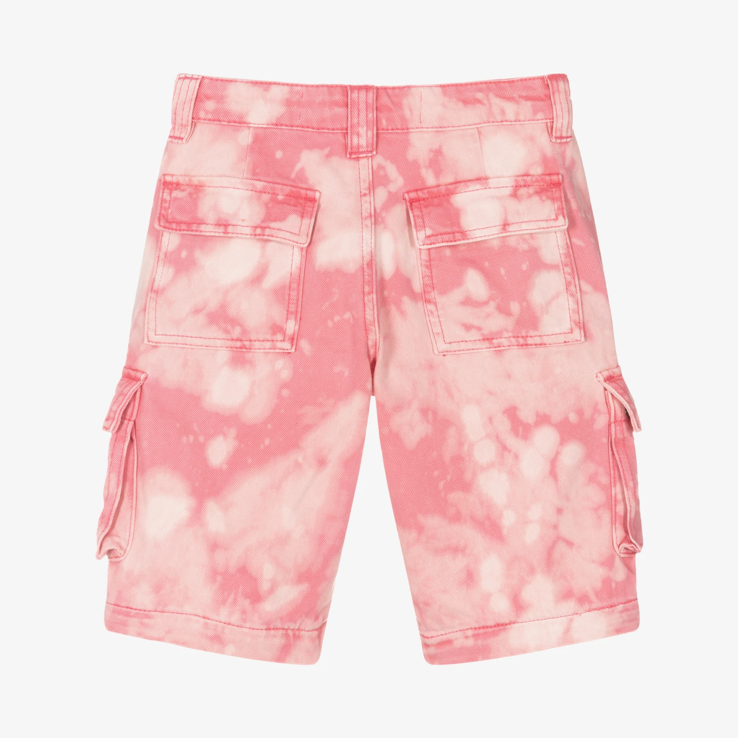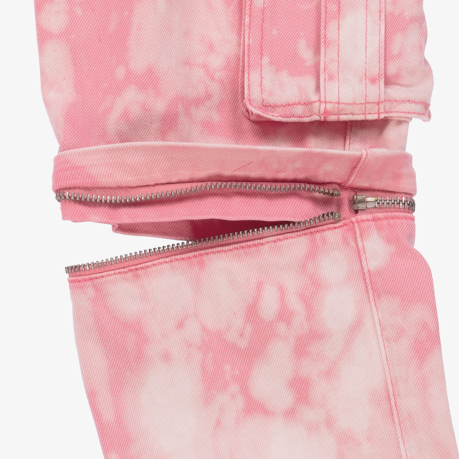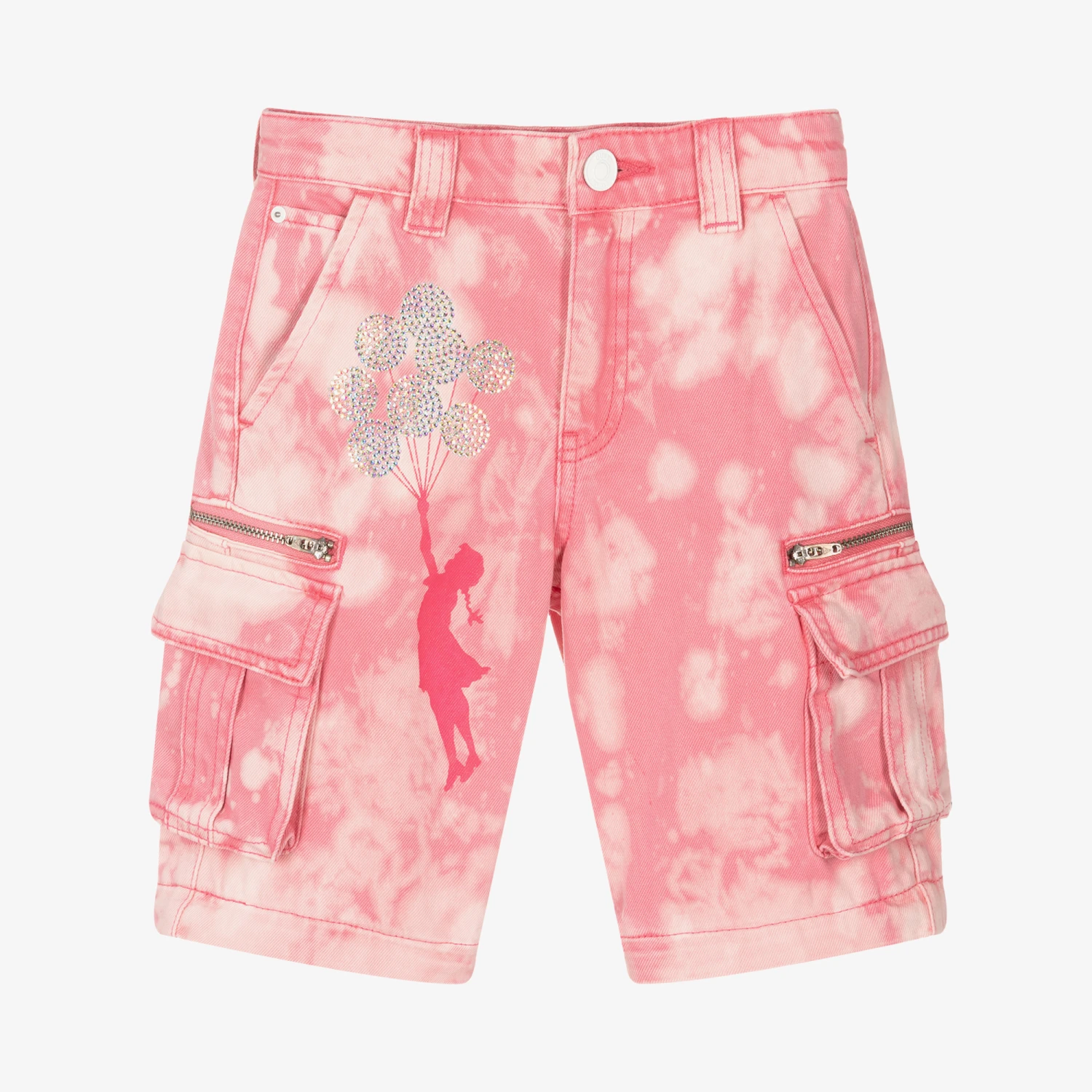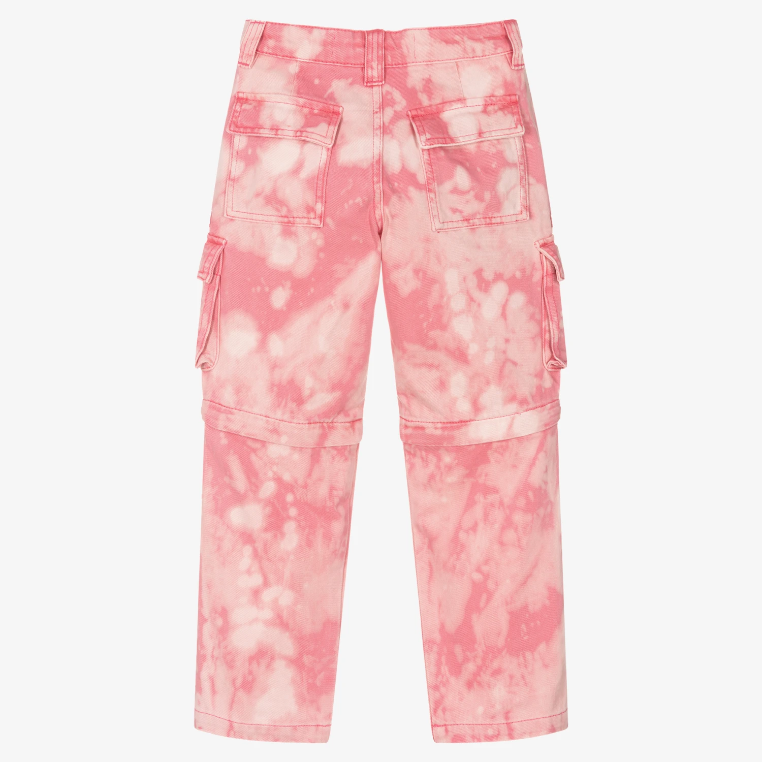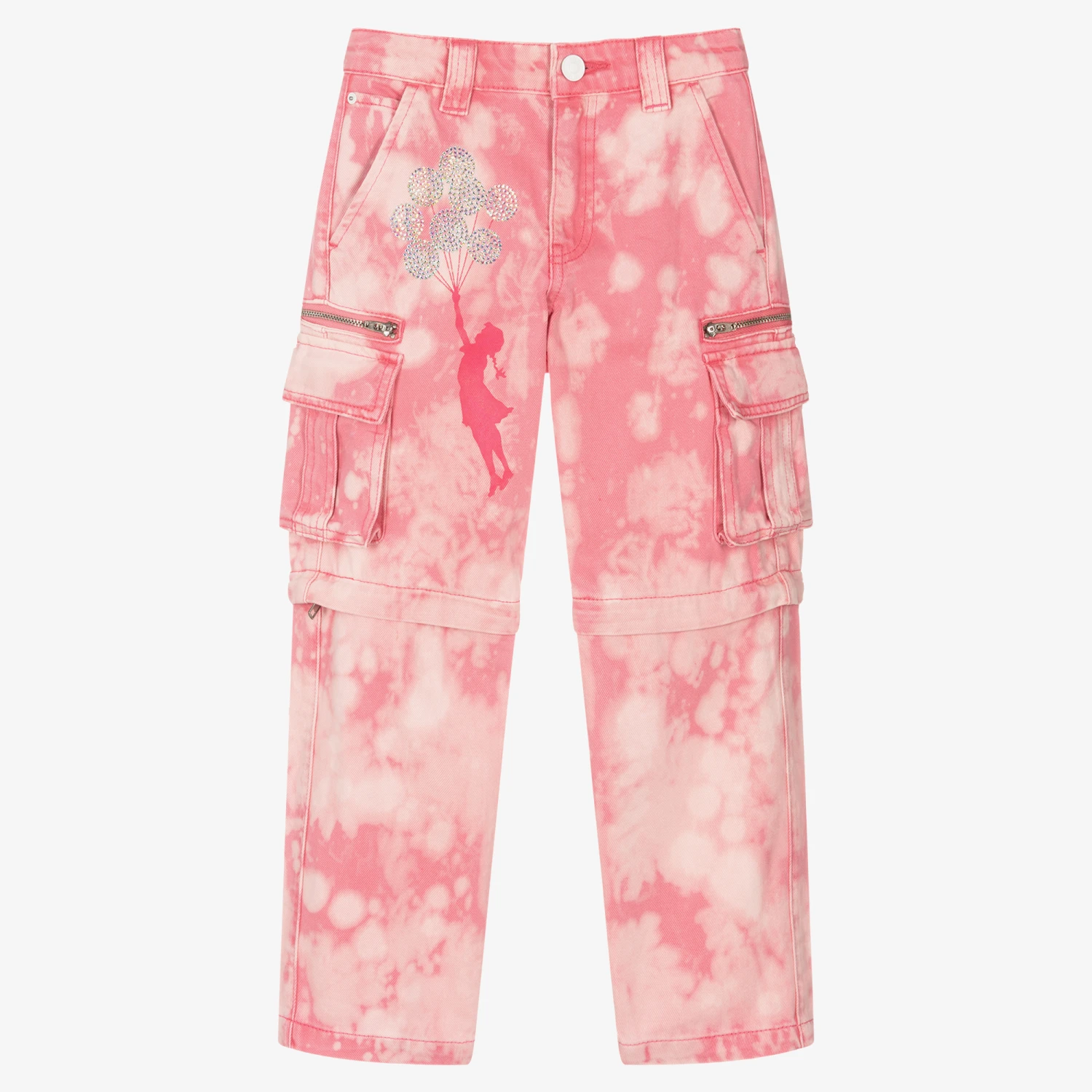 Funky pink denim jeans for junior girls from Guess, with a fun tie-dye pattern and zip off legs to become shorts for two looks in one. Forming part of the designer’s Brandalised capsule, these jeans have iconic artwork from graffiti artist Banksy on the front embellished with rhinestones for added sparkle. With multiple useful pockets, they have a fun utility style and fasten with a branded button above a zip for a final designer touch.