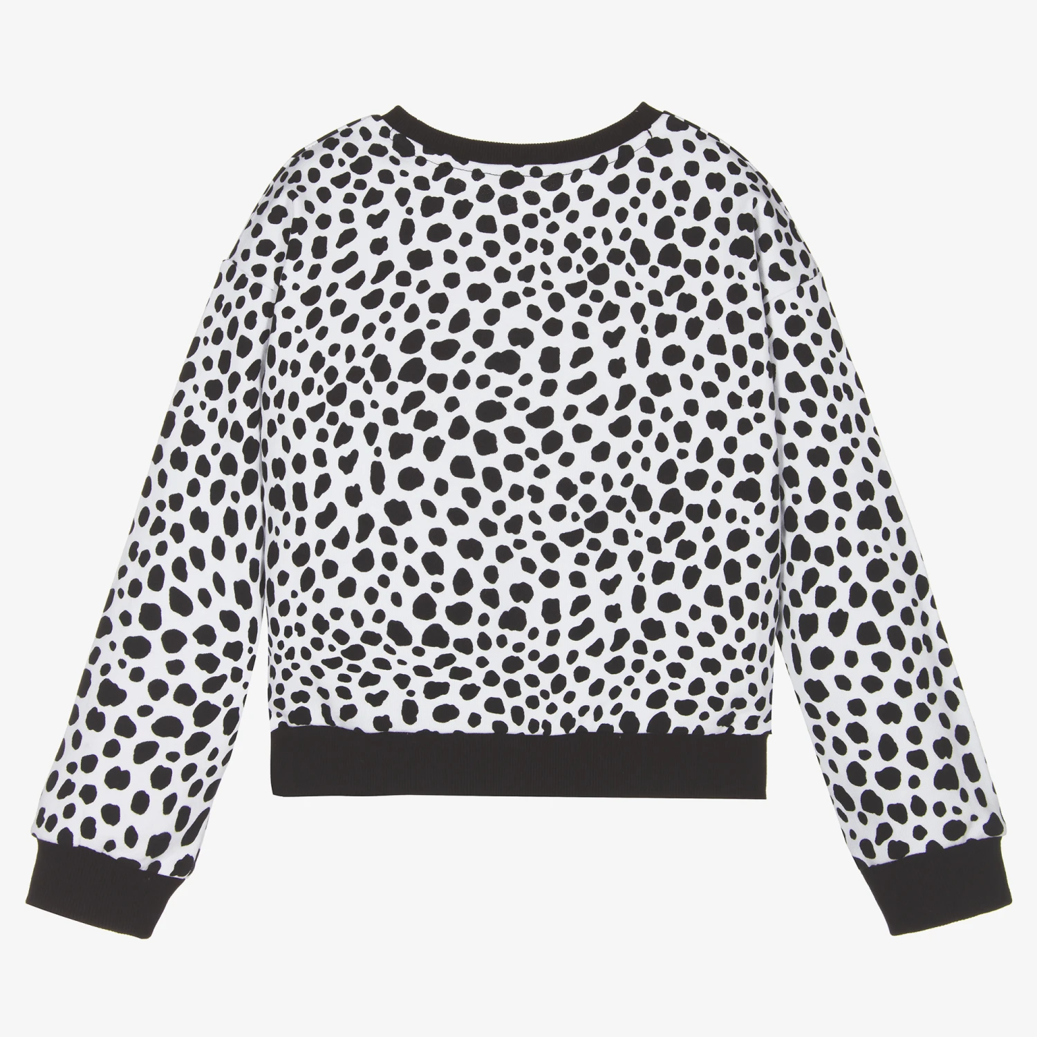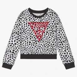 Girls white and black Dalmatian print sweatshirt by Guess, made in soft organic cotton jersey. It has the brand’s signature red Triangle logo embroidered on the front and ribbed trims.
