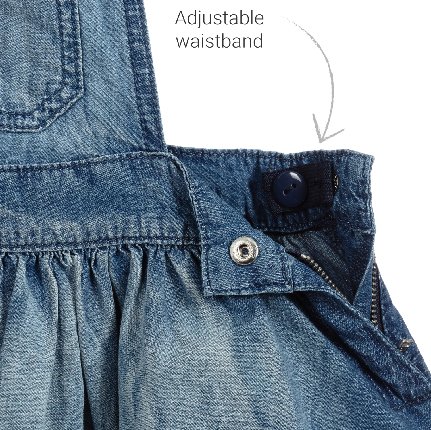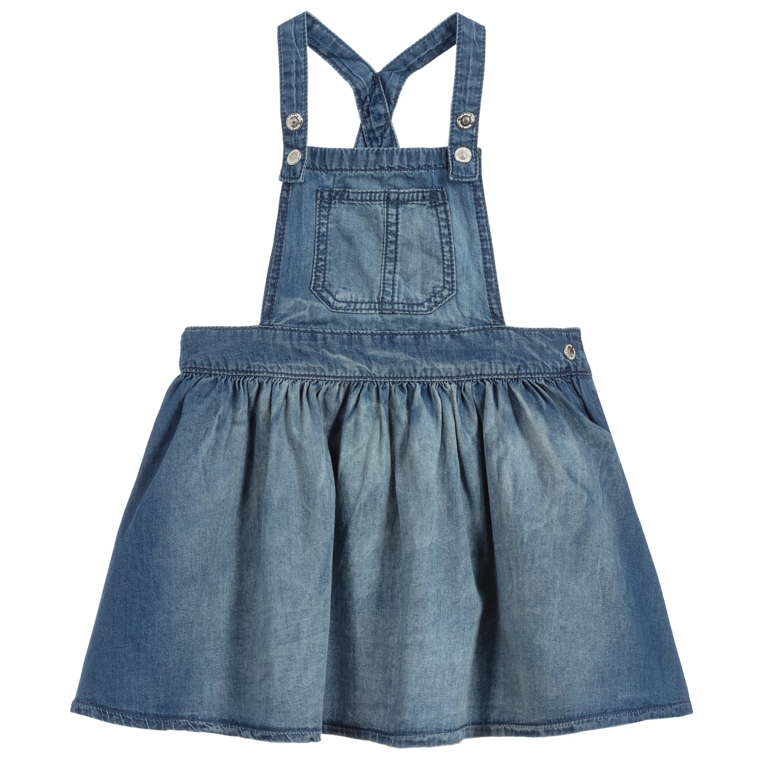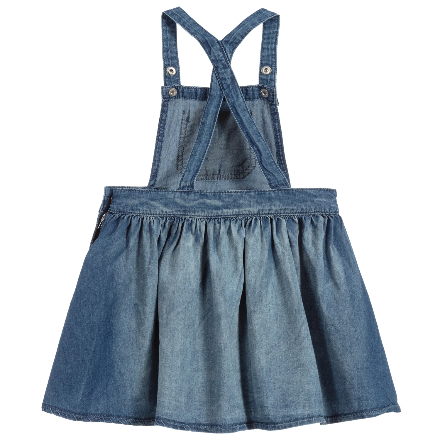 A lovely blue dungaree dress in lightweight cotton by iDO Baby. It has adjustable popper fastening straps, and a side zip fastening.