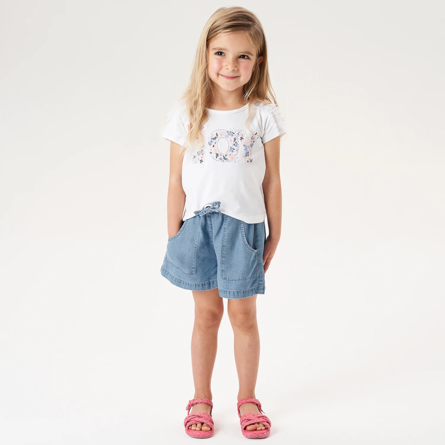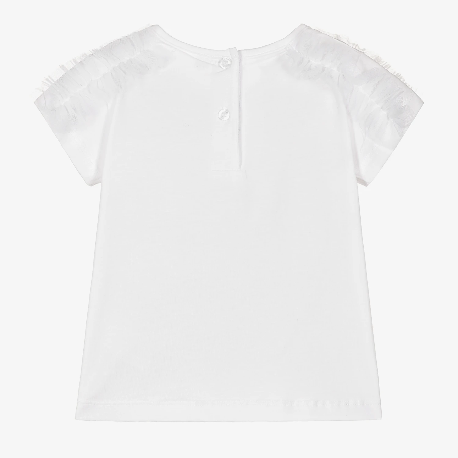 White T-shirt for girls by Italian brand iDO Baby, made in soft and comfortable cotton jersey. It has ‘Be Joy’ printed in glittery and floral letters, with diamanté details and ruffled tulle trim shoulders. There are button fastenings on the back of smaller sizes to help with easier dressing.