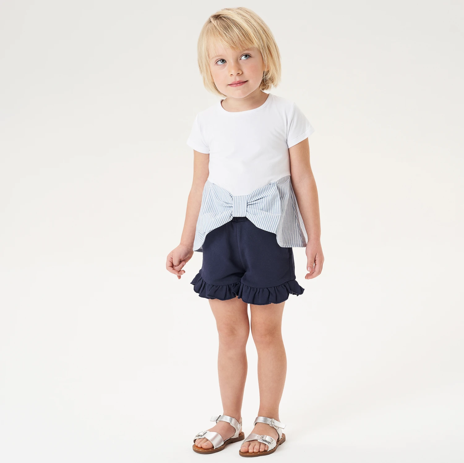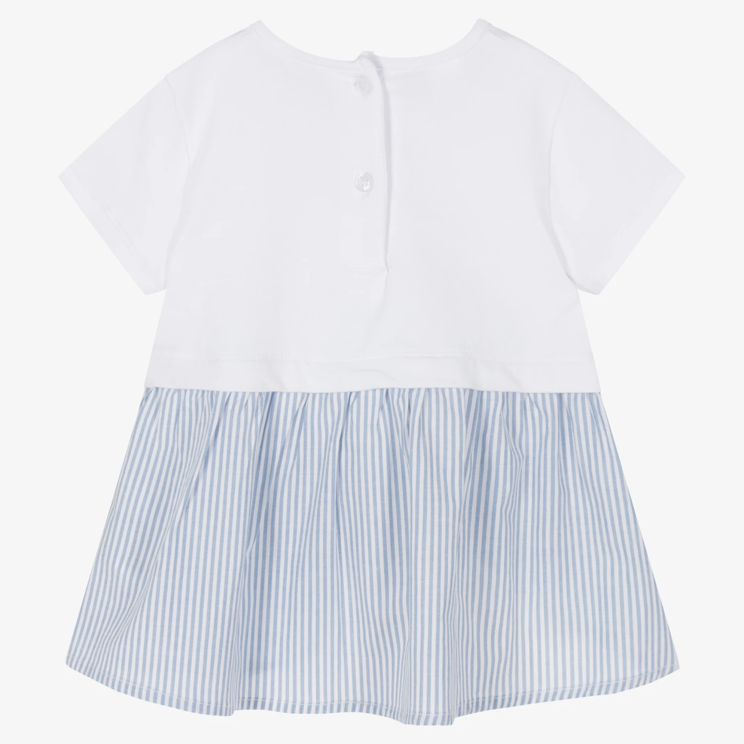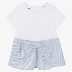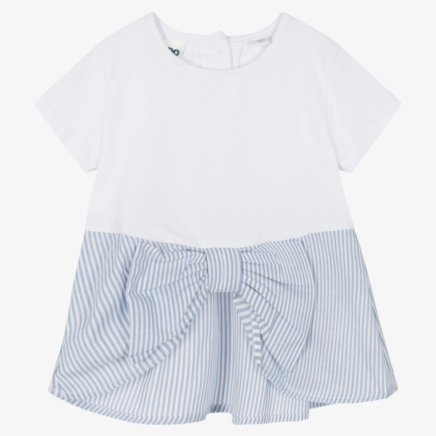 White T-shirt for girls by Italian brand iDO Baby, made in super soft cotton jersey. It has a blue striped trim with an eye-catching bow on the front, and useful button fastenings on the back.