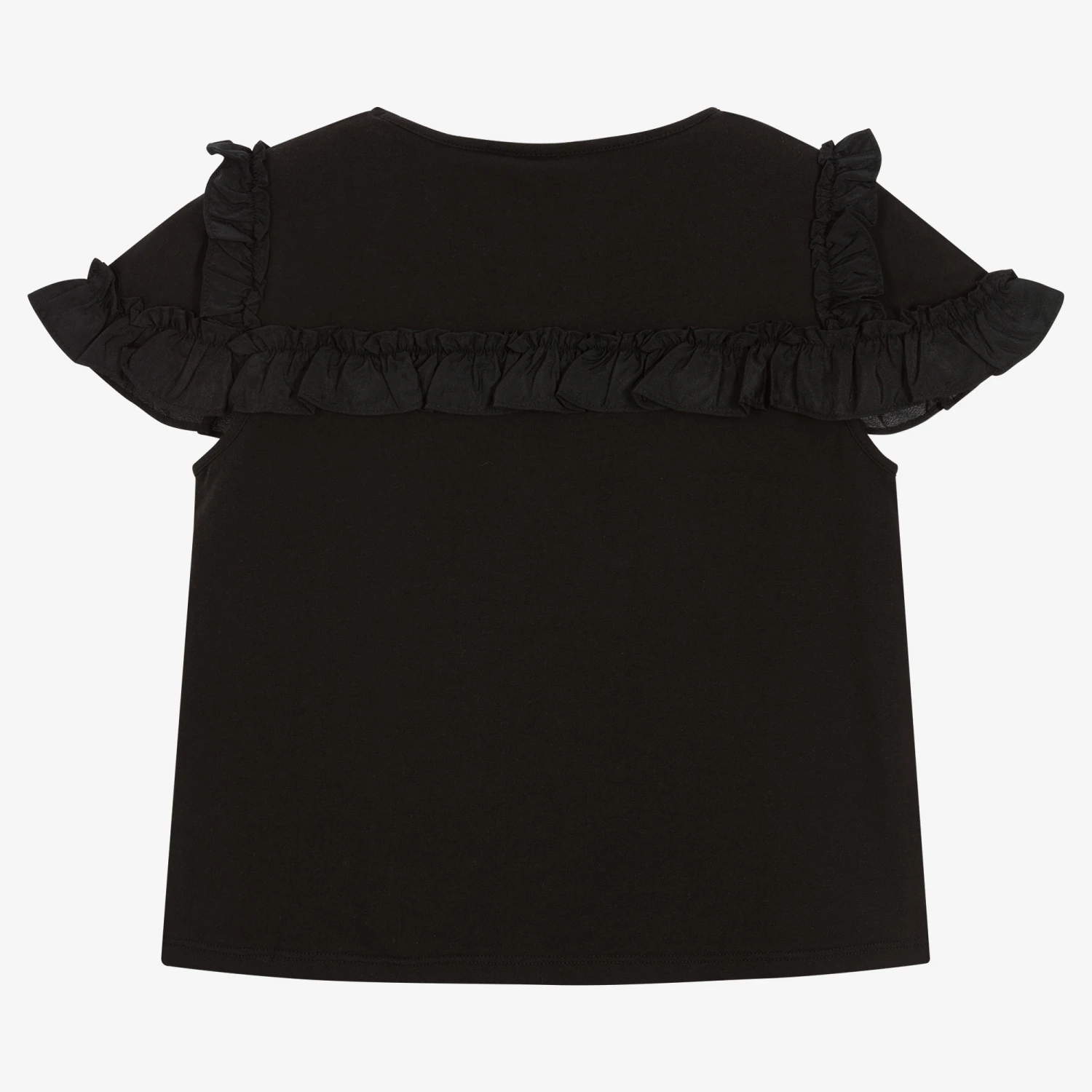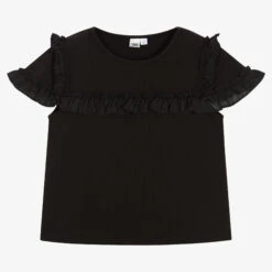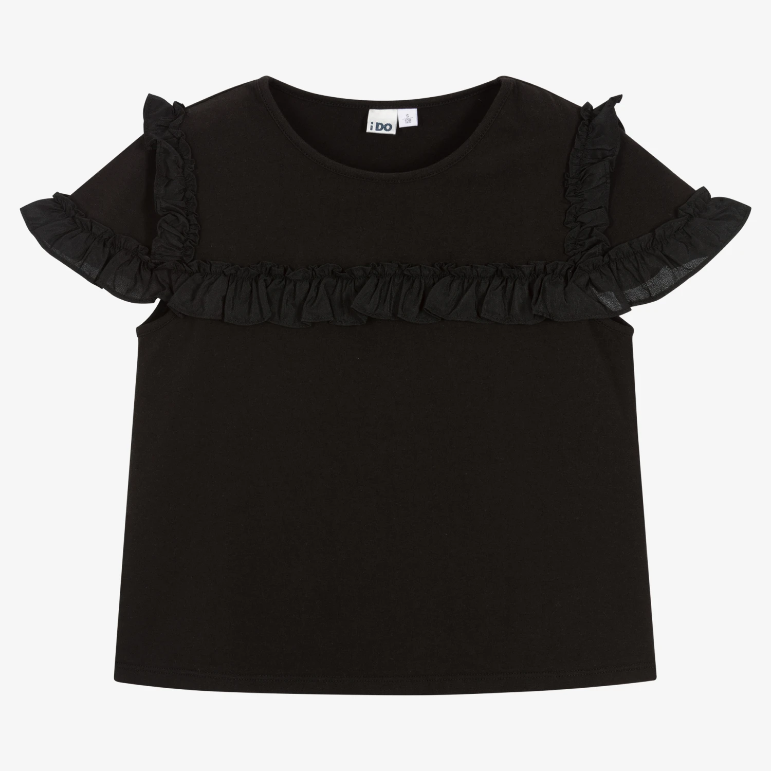 A casual black T-shirt for girl by iDO Junior, trimmed with pretty ruffles for a feminine touch. Made in soft cotton jersey, it is easy and comfortable to wear.
