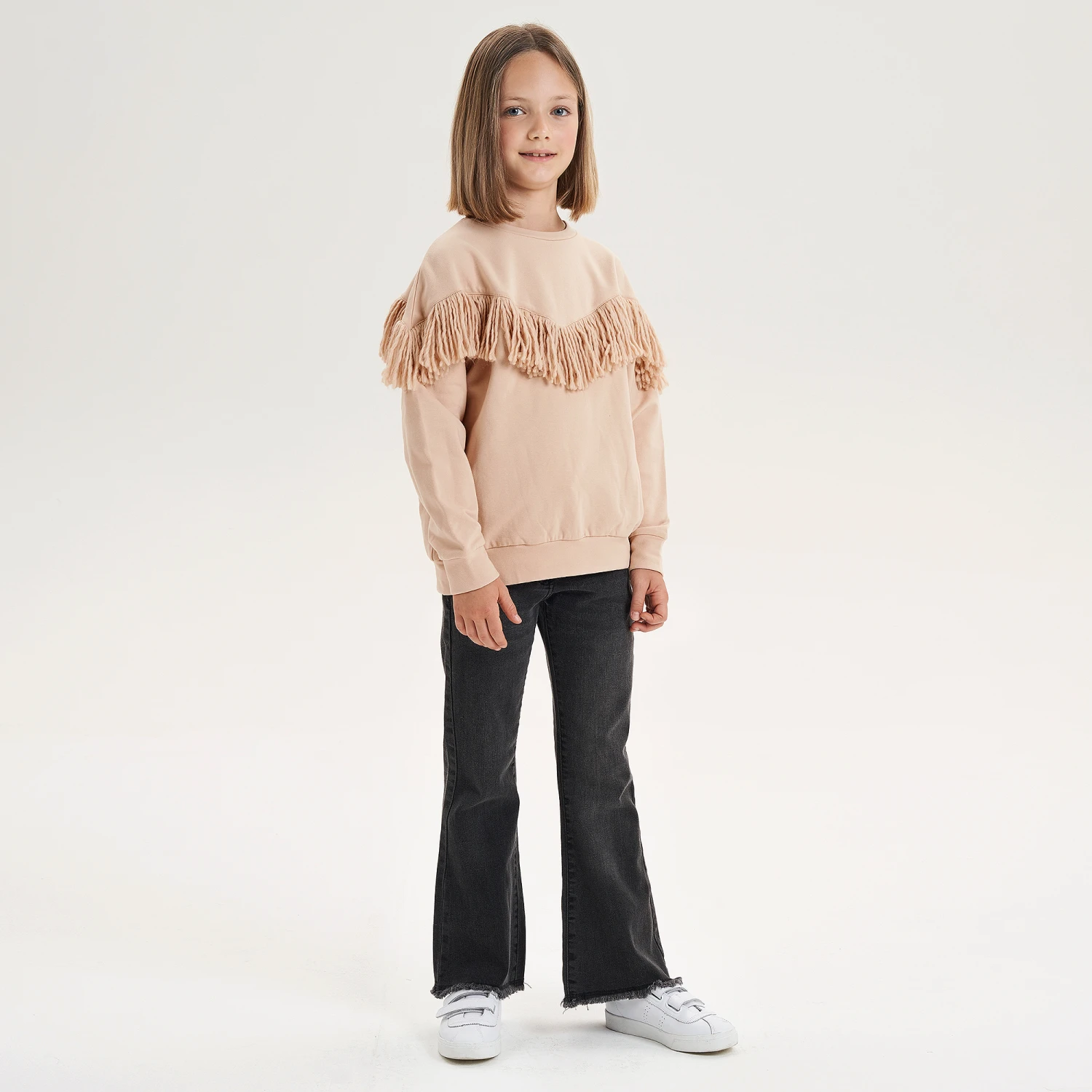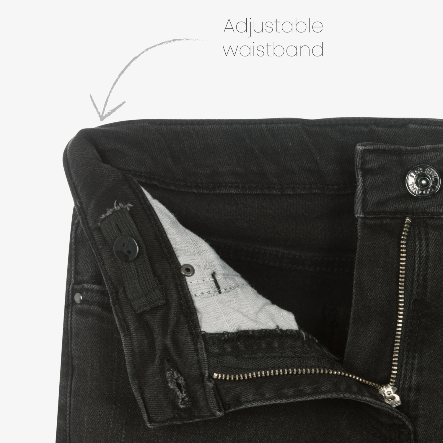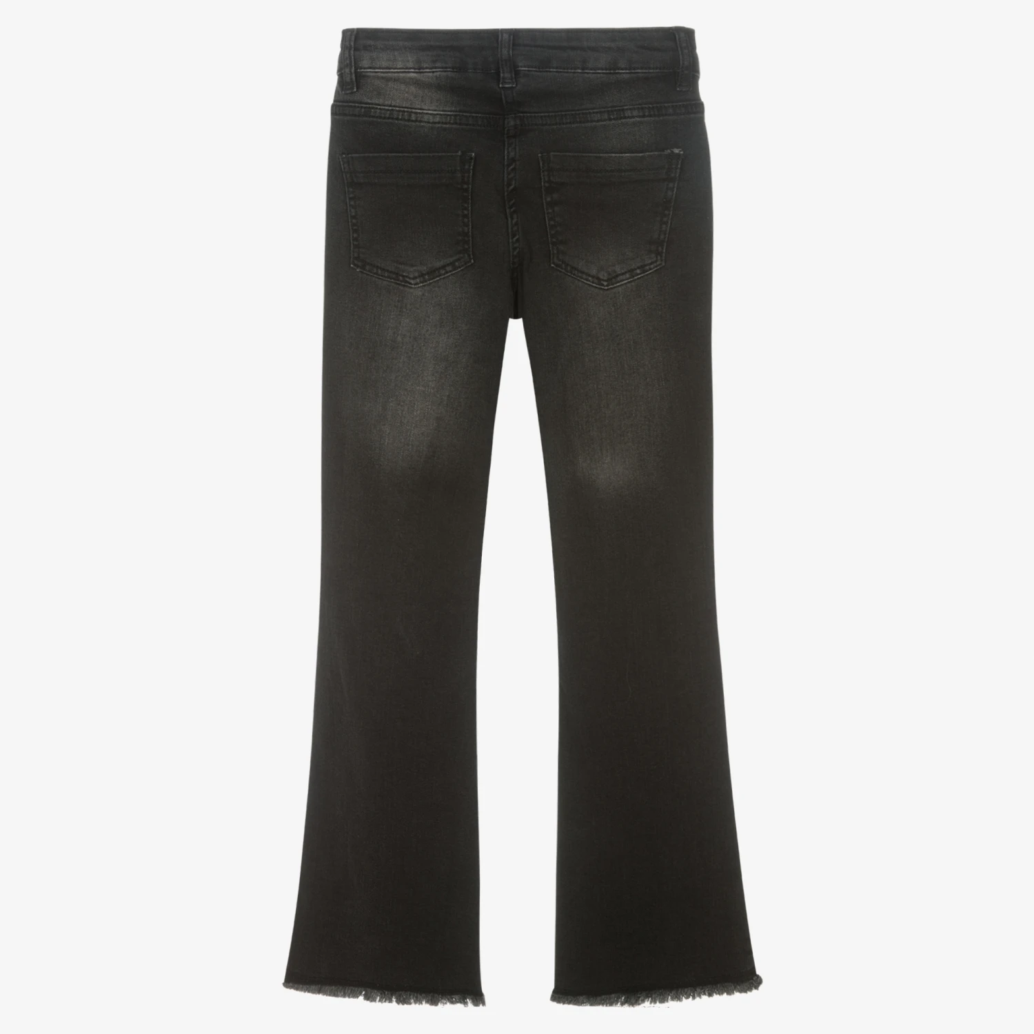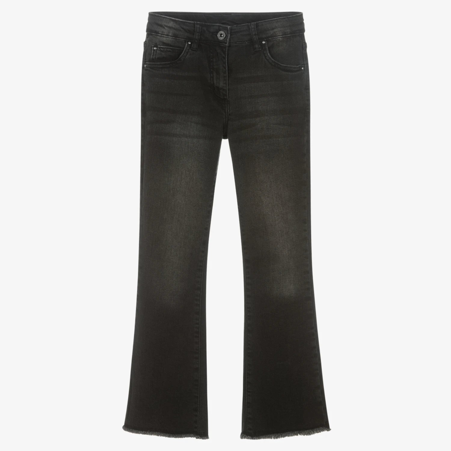 Washed black denim jeans for girls from iDO Junior. These cool flares have raw edges on the hem and classic five-pocket styling. Comfortable and easy to wear, they are made in a soft, stretchy cotton blend with a front button and zip fastening and an adjustable waist for a great fit.