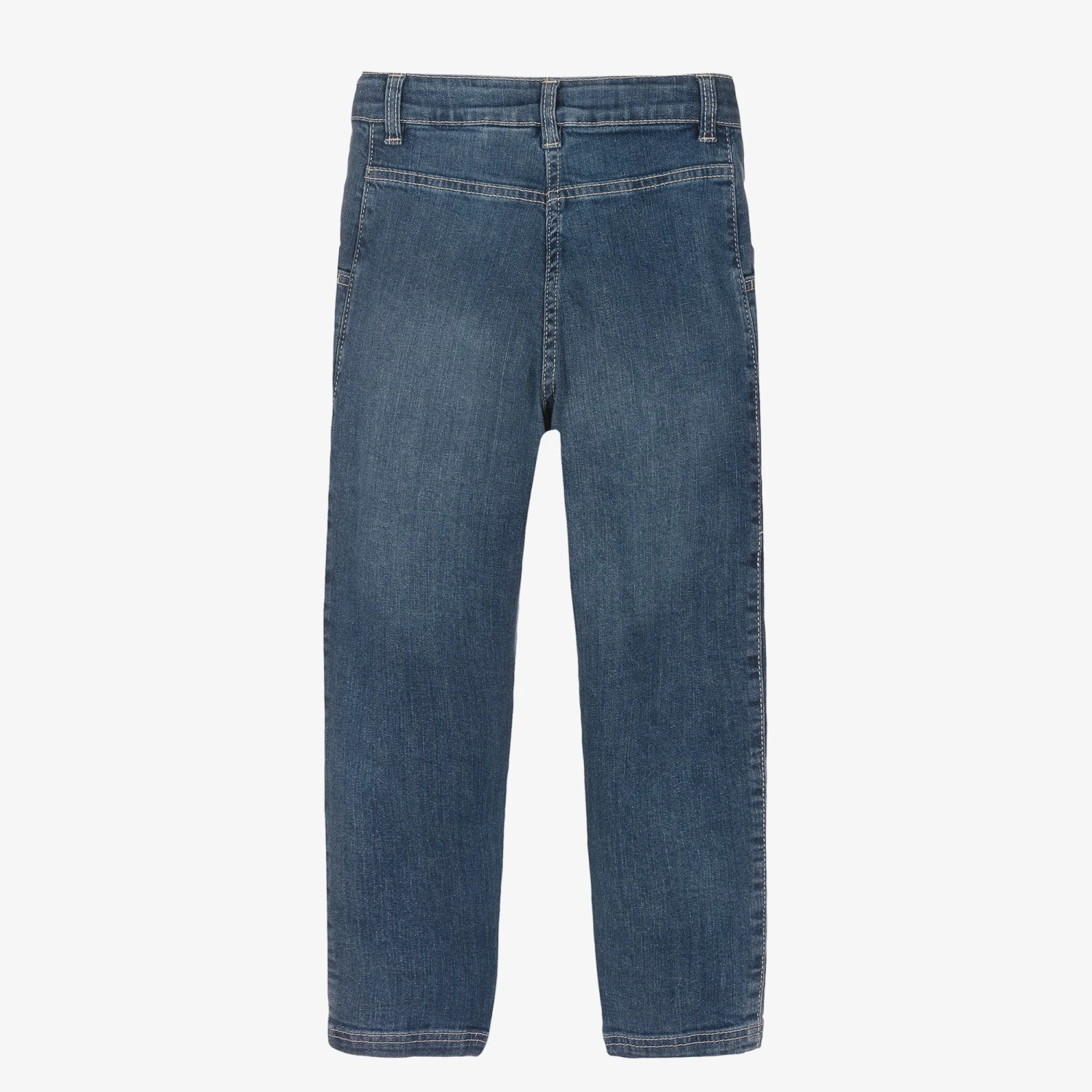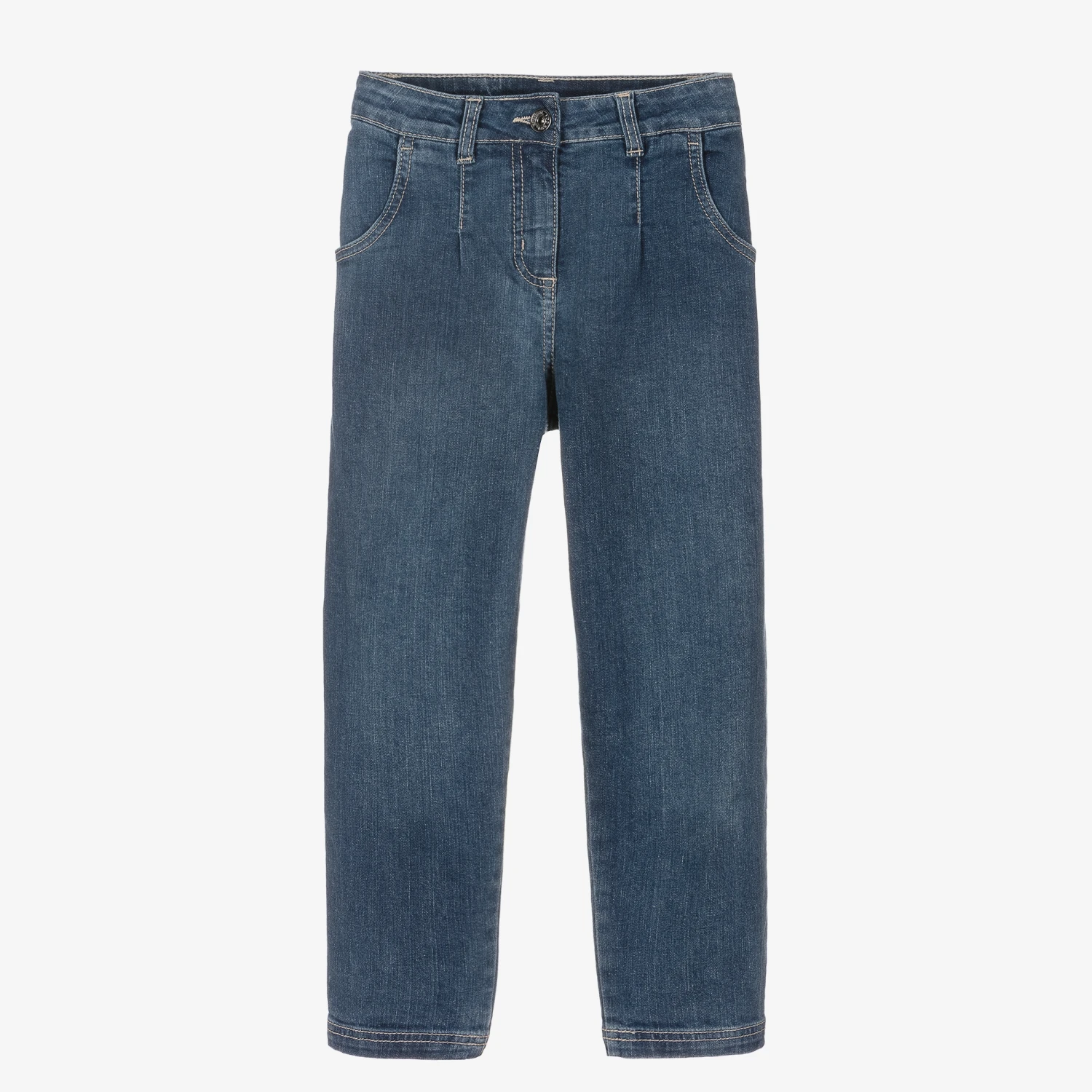 Washed blue Mom jeans for girls by iDO Junior, made in soft cotton denim. They fasten with a button and zip, have two front pockets and an adjustable waistband. They are high waisted, with a loose-fitting shape that tapers towards the ankle.