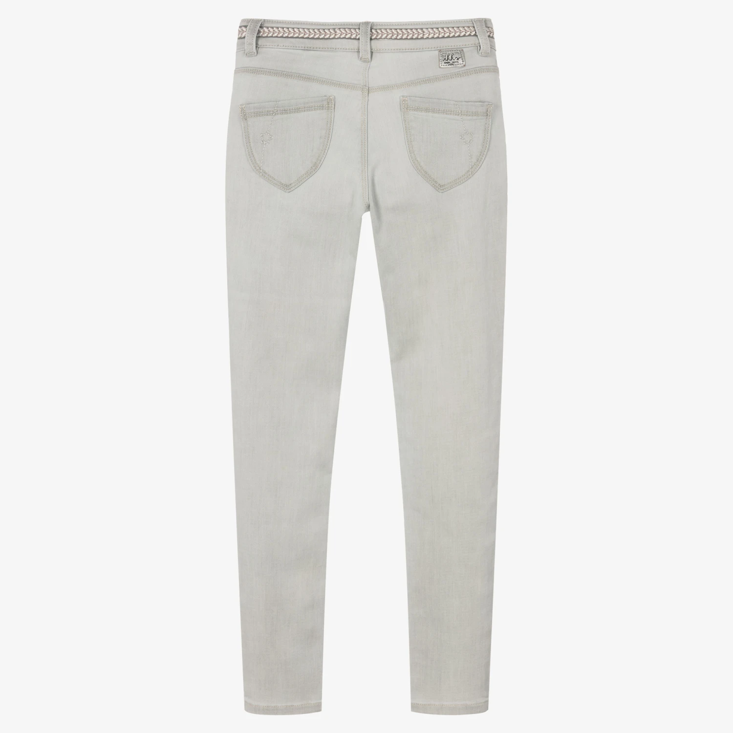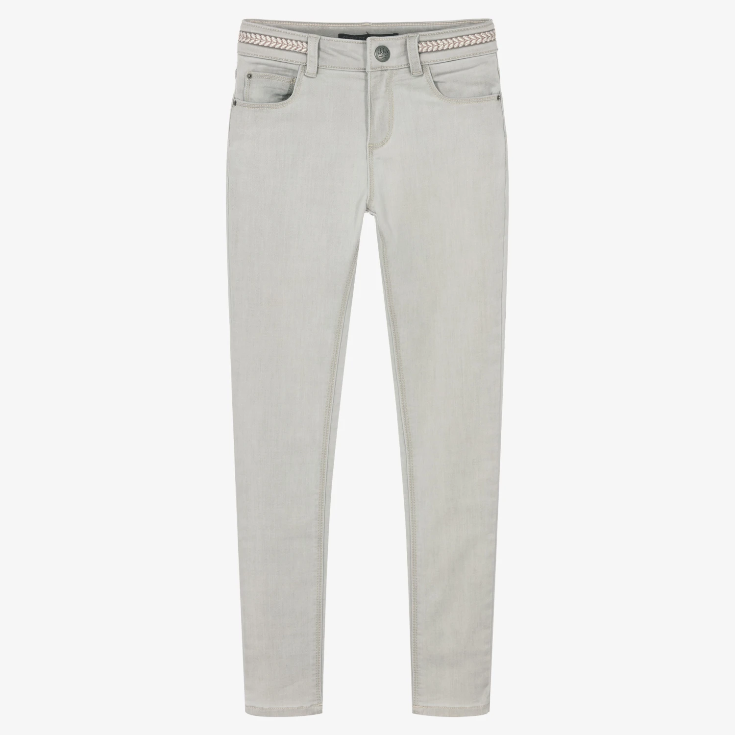 Light grey jeans for girls by French brand IKKS, made in a soft and stretchy cotton denim blend. These skinny fit jeans have an embroidered floral pattern around the waist, a zip and hook fastening and five-pocket styling. They have an adjustable waistband and a silver patch logo on the back.