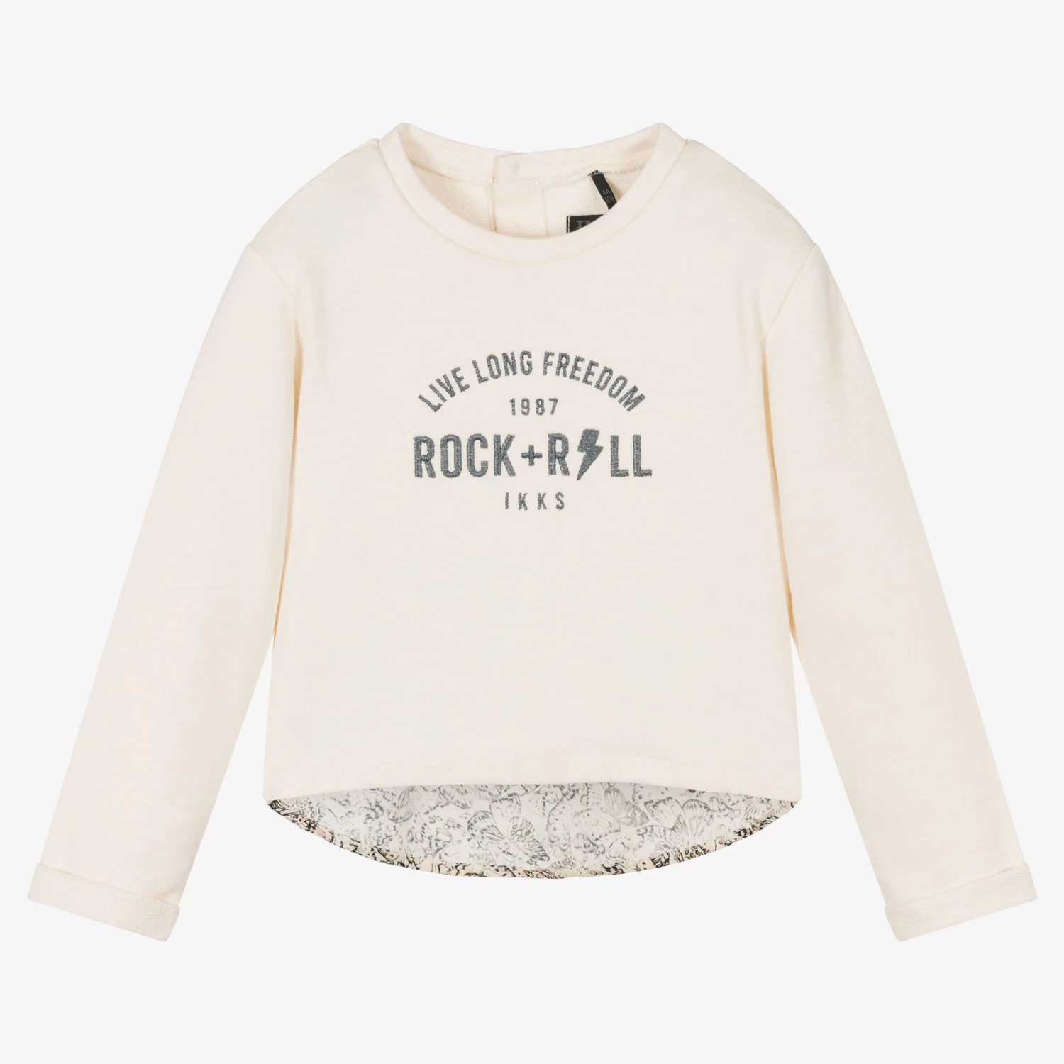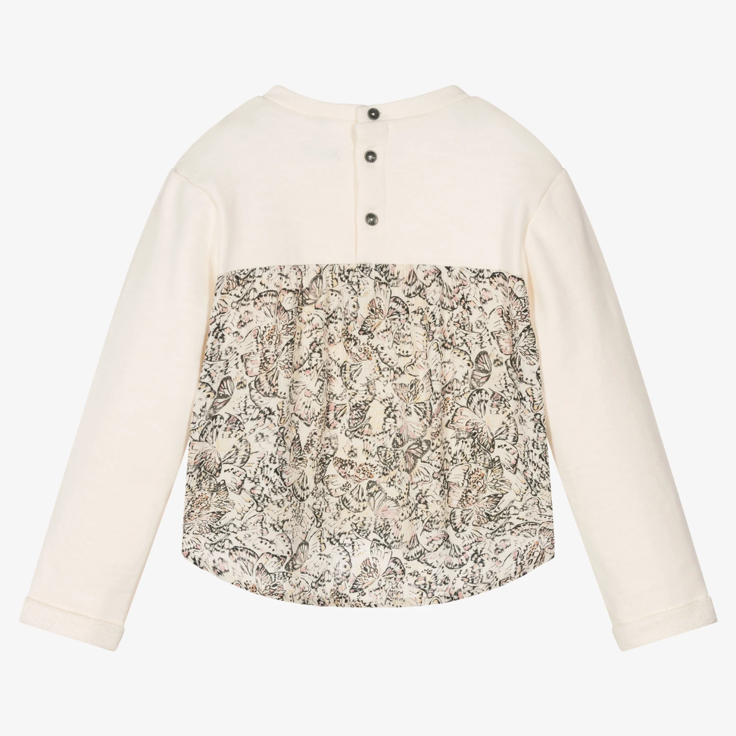 A pretty ivory sweatshirt for girls by French brand IKKS, made in the softest cotton jersey with a looped underside. It has an embroidered grey logo on the front, turn-up cuffs, and a flowy viscose insert with a butterfly design. There are useful button fastenings on the back.