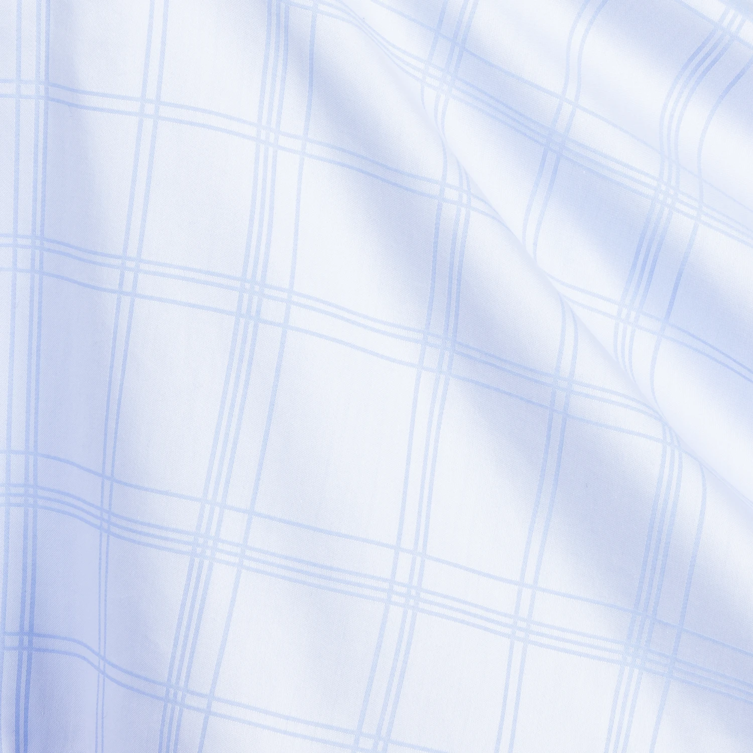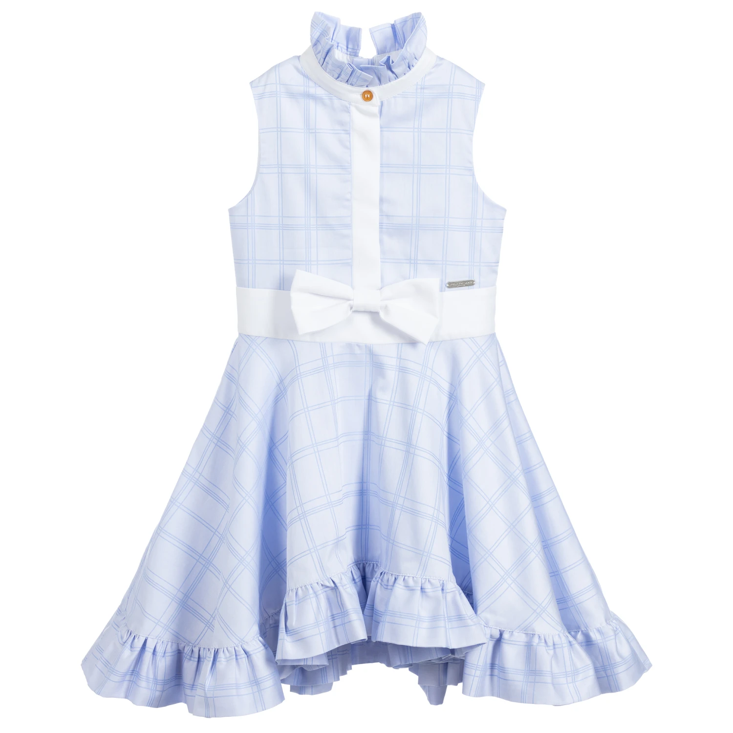 A pale blue checked cotton dress for girls by Jessie and James London. It has pretty ruffles on the collar, and layered ruffles on the hem and petticoat beneath, to give the skirt volume. There is smart white trim on the concealed button placket and waistband, with a large white bow on the waist.