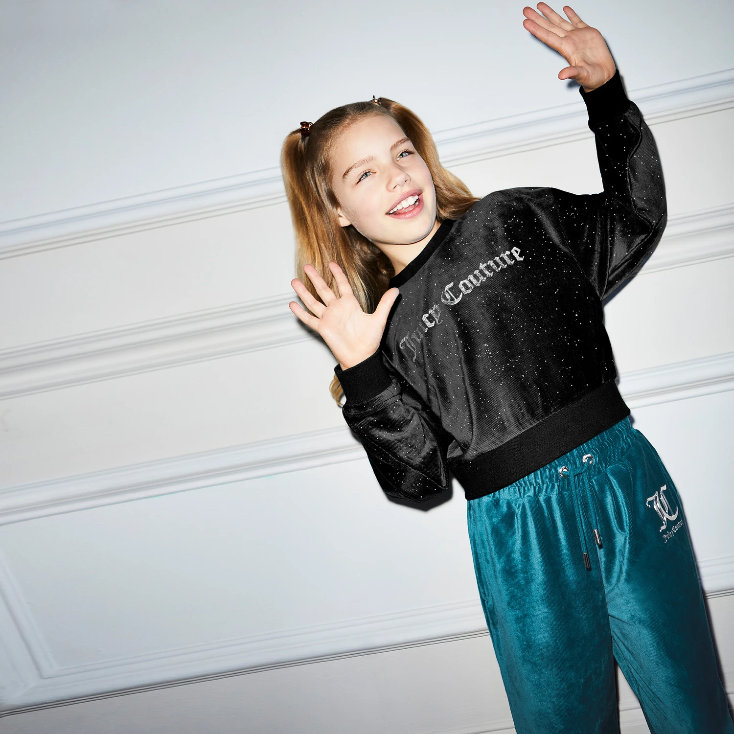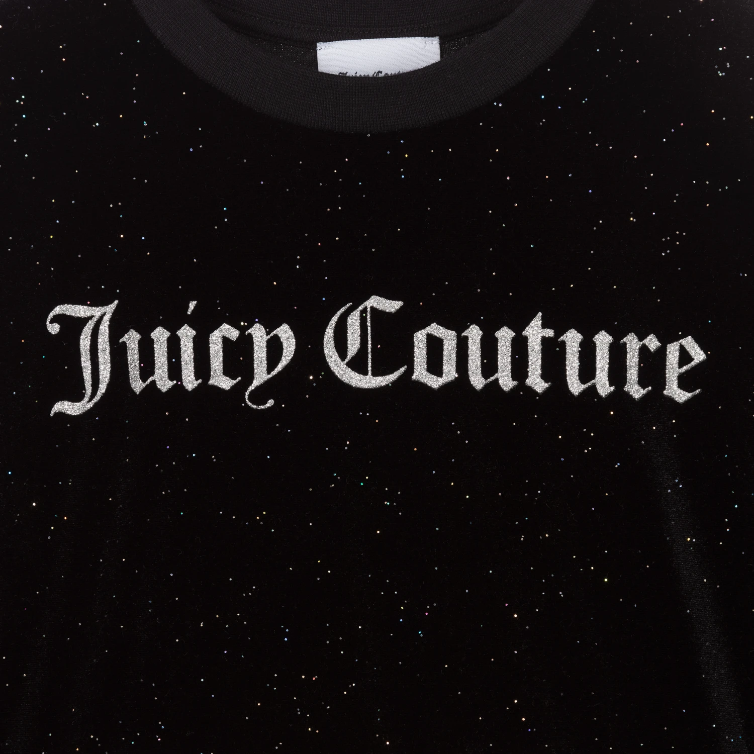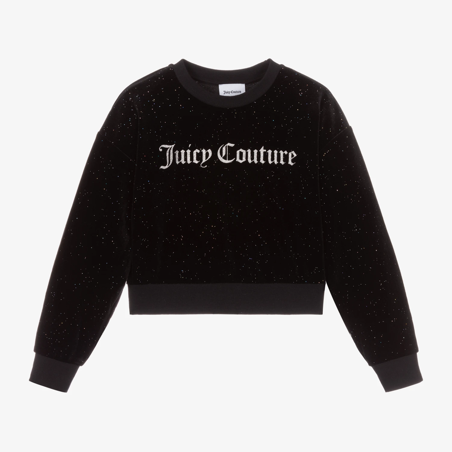 Black sweatshirt for girls by Juicy Couture, made from the brand’s iconic super stretchy velour. Printed with the brand’s logo on the front in glittery silver, it has stretchy elasticated cuffs.