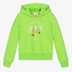 Bright green hooded sweatshirt for girls by Juicy Couture, made in a soft cotton blend jersey. It has a lime fruit motif on the front, with a glittery silver logo print.