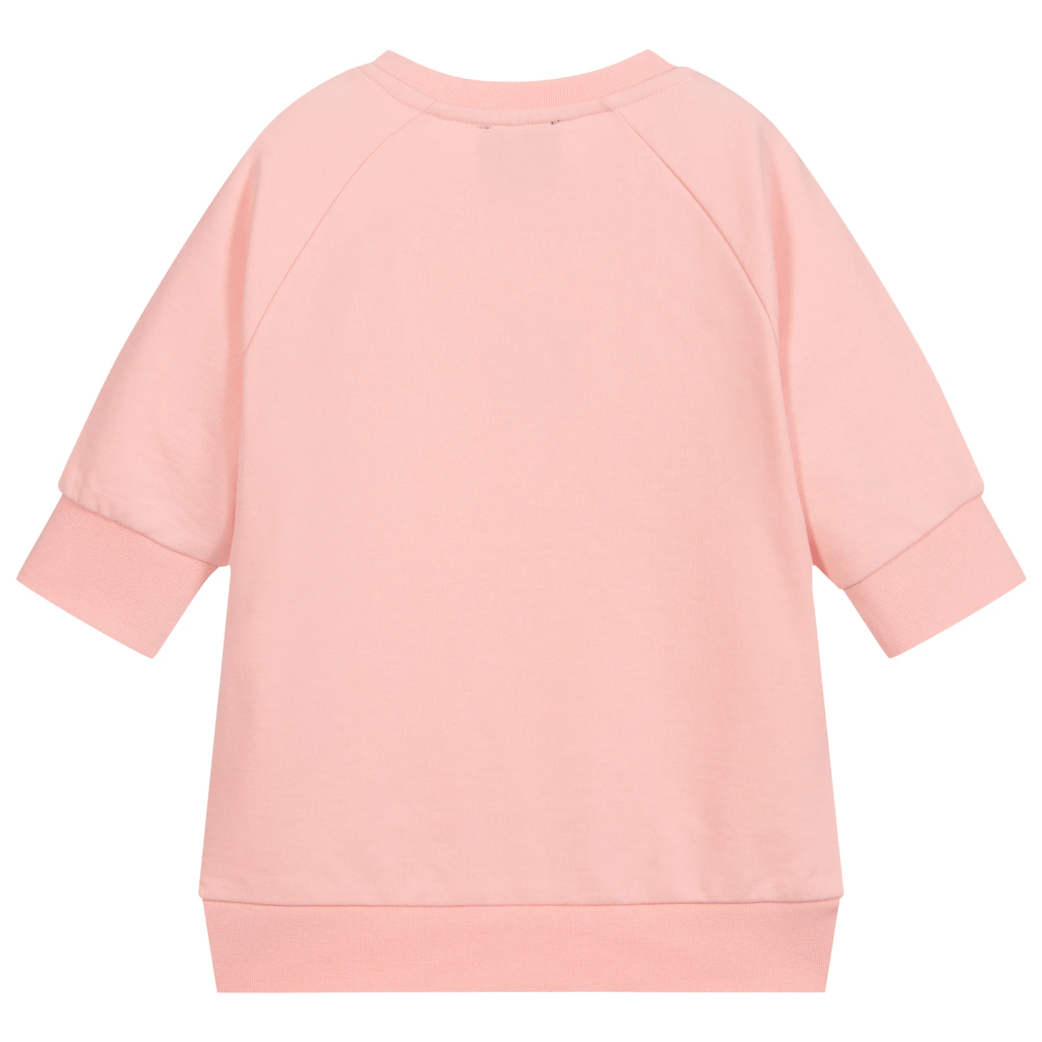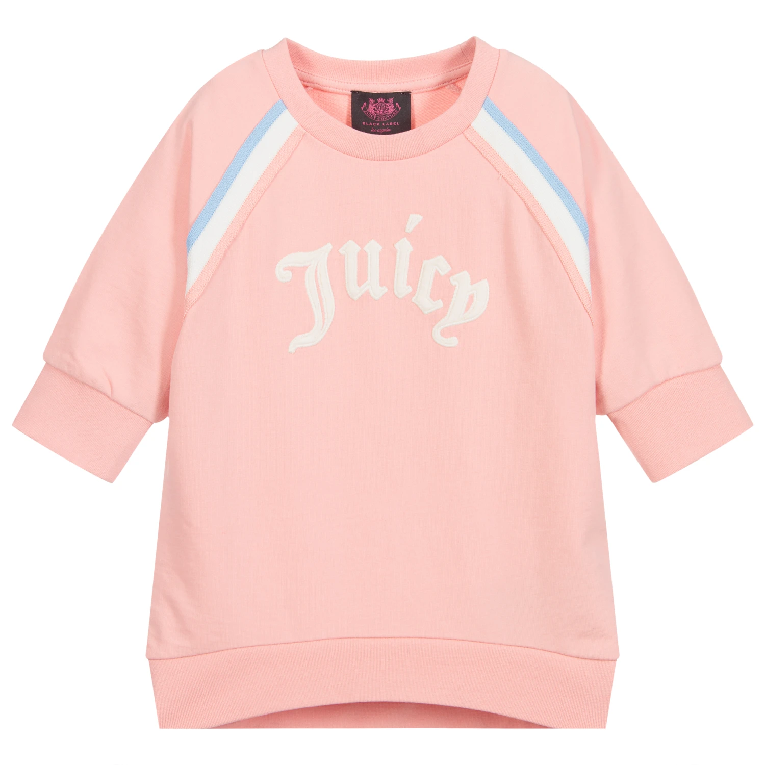 Pink sweatshirt by Juicy Couture, with the brand’s logo across the front in ivory velour. Made in comfortable cotton jersey with a looped underside, it has bands of pale blue, ivory and pink on the sleeves.