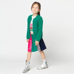 Fabulous pale pink special occasion T-shirt for girls by Junona. Made in soft, stretchy cotton jersey, it is comfortable as well as striking, with its large puffed organza sleeves patterned with pink, purple and grey flowers. There are matching organza appliqués on the bodice, and sparkling crystals on both the front and back.