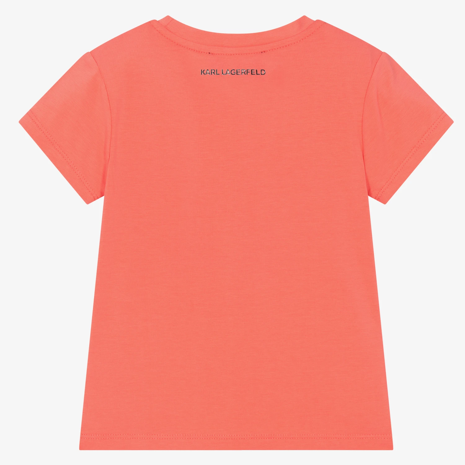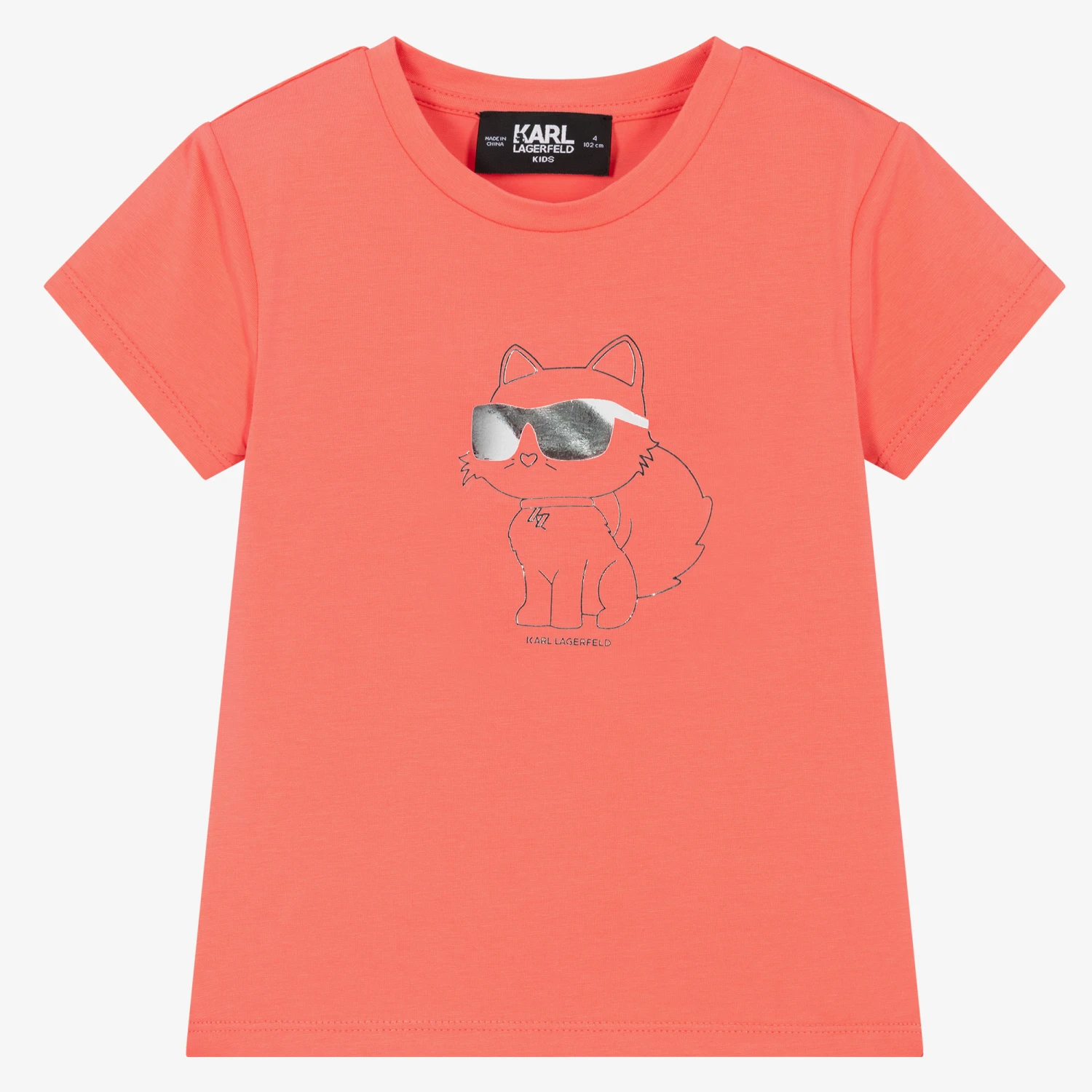Orange organic cotton and modal blend T-shirt for girls by KARL LAGERFELD KIDS. It has the brand’s cute Choupette and logo printed on the front in shiny silver, inspired by the NFT KARL LAGERFELD Collection, with a further logo around the back. It is made in super soft, comfortable jersey, so is just right for relaxed days.