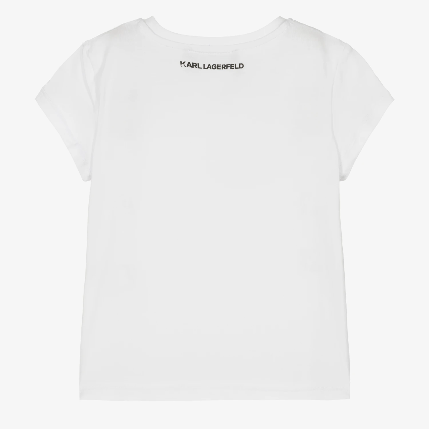 White Mini-me T-shirt for girls by KARL LAGERFELD KIDS, made in soft organic cotton and modal blend jersey. It has the brand’s well-known Choupette logo printed on the front, inspired by the NFT KARL LAGERFELD Collection, with a further black logo printed on the back of the neck.