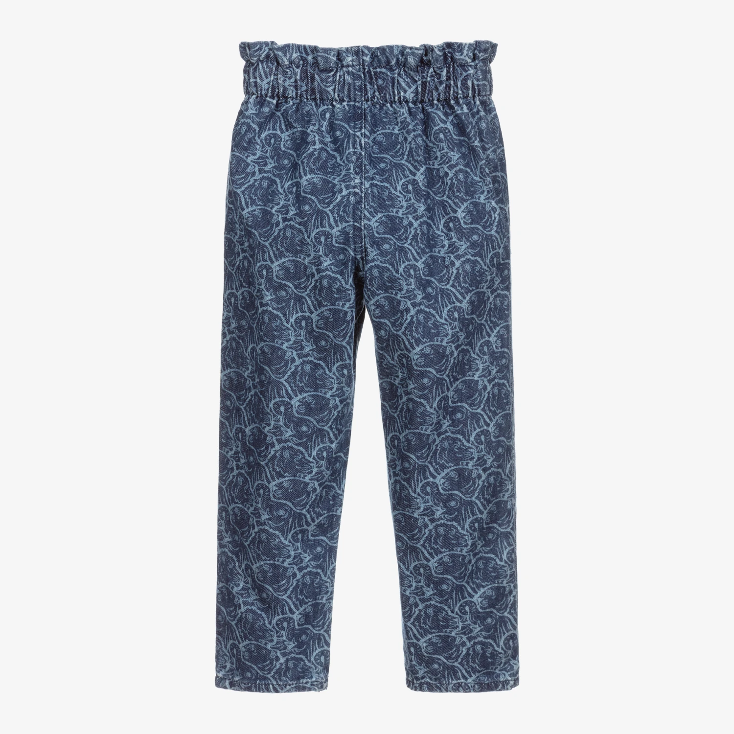 Girls mid-blue relaxed fit jeans by KENZO KIDS, made in soft, lightweight denim. They are patterned with a wildlife-inspired camo design that features the brand’s Tiger & Friends logo. They have a stylish gathered, elasticated waistband and two front pockets. They fasten with a popper and zip.
