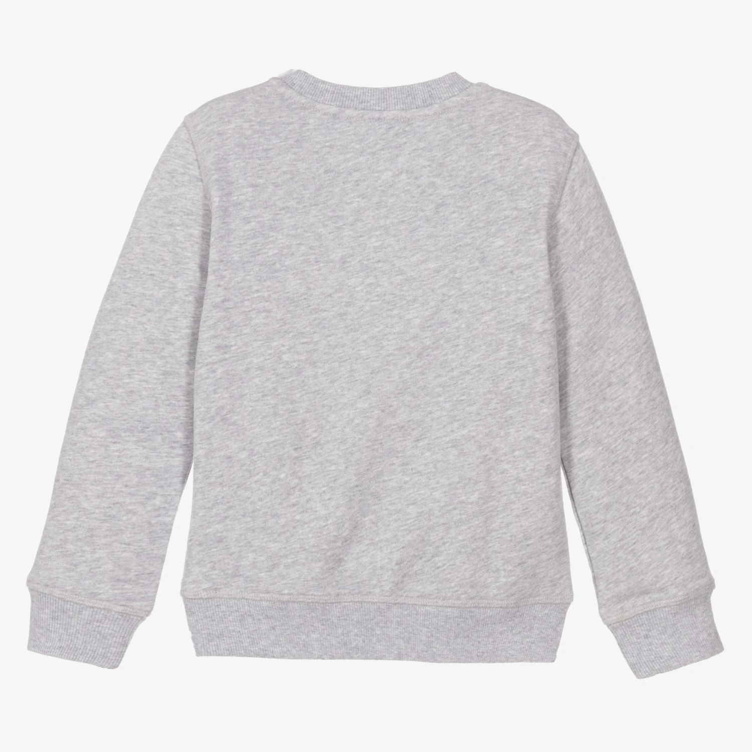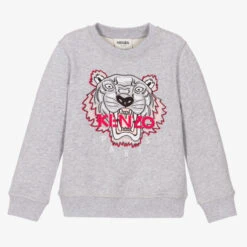 Grey marl sweatshirt for girls by luxury French designer KENZO KIDS. It has the brand’s iconic Tiger embroidered on the front in pink and black, with a pink appliqué logo across it. It is made in comfortable cotton jersey with ribbed trims.