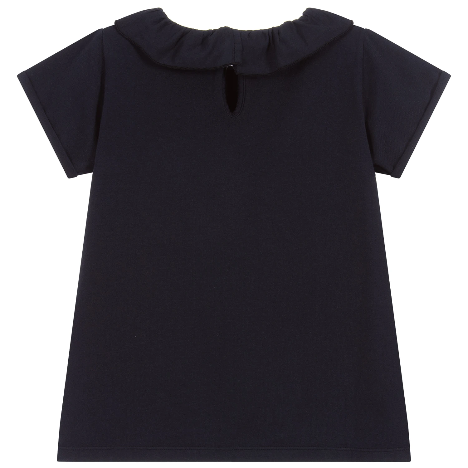 Navy blue T-shirt for girls by Laranjinha, made in soft cotton jersey. It has a pretty white collar and a keyhole button fastening on the back.