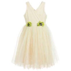 A gorgeous Childrensalon Exclusive dress for girls by Le Mu, made in layers of green tulle and beige lace, creating an elegant silhouette. The cross-over bodice has pleated tulle detail, gathered at the waist with a full skirt. On the front, there are pretty green, white and black sequined flowers.