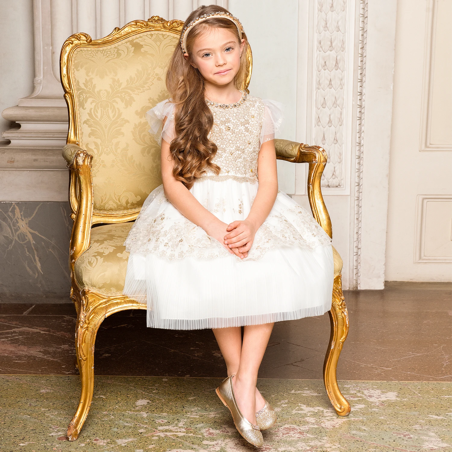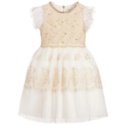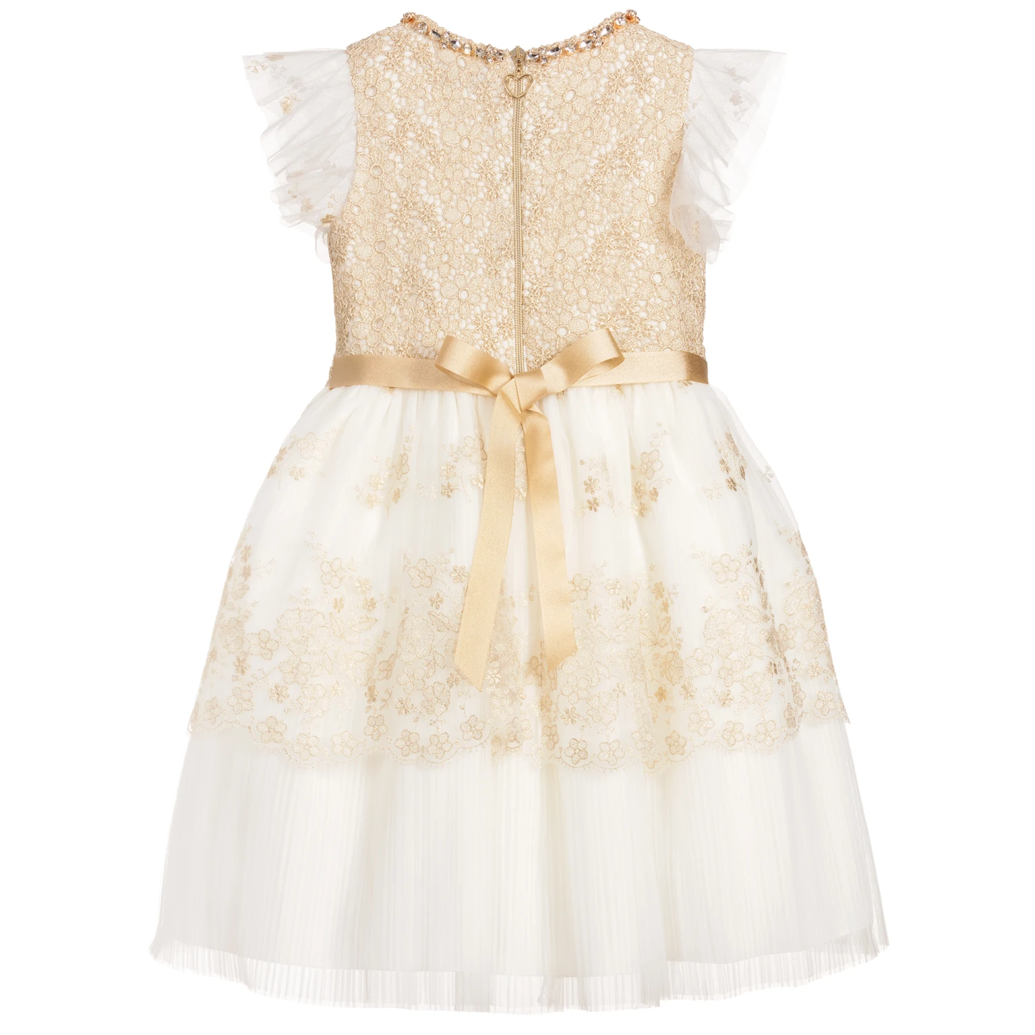 Gorgeous gold and ivory dress by luxury designer Lesy. The pretty floral lace bodice has sparkly crystal details on the neckline and on the front. The layers of lovely tulle skirt are pleated with a gold floral hand-embroidered overlayer, matching the sleeves. It is lined in soft cotton with tulle for added volume and finished with a grosgrain sash to tie on the back.