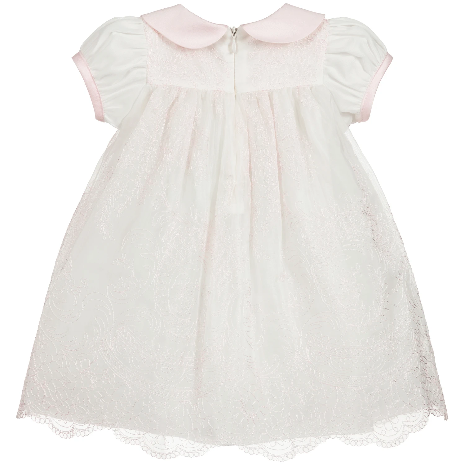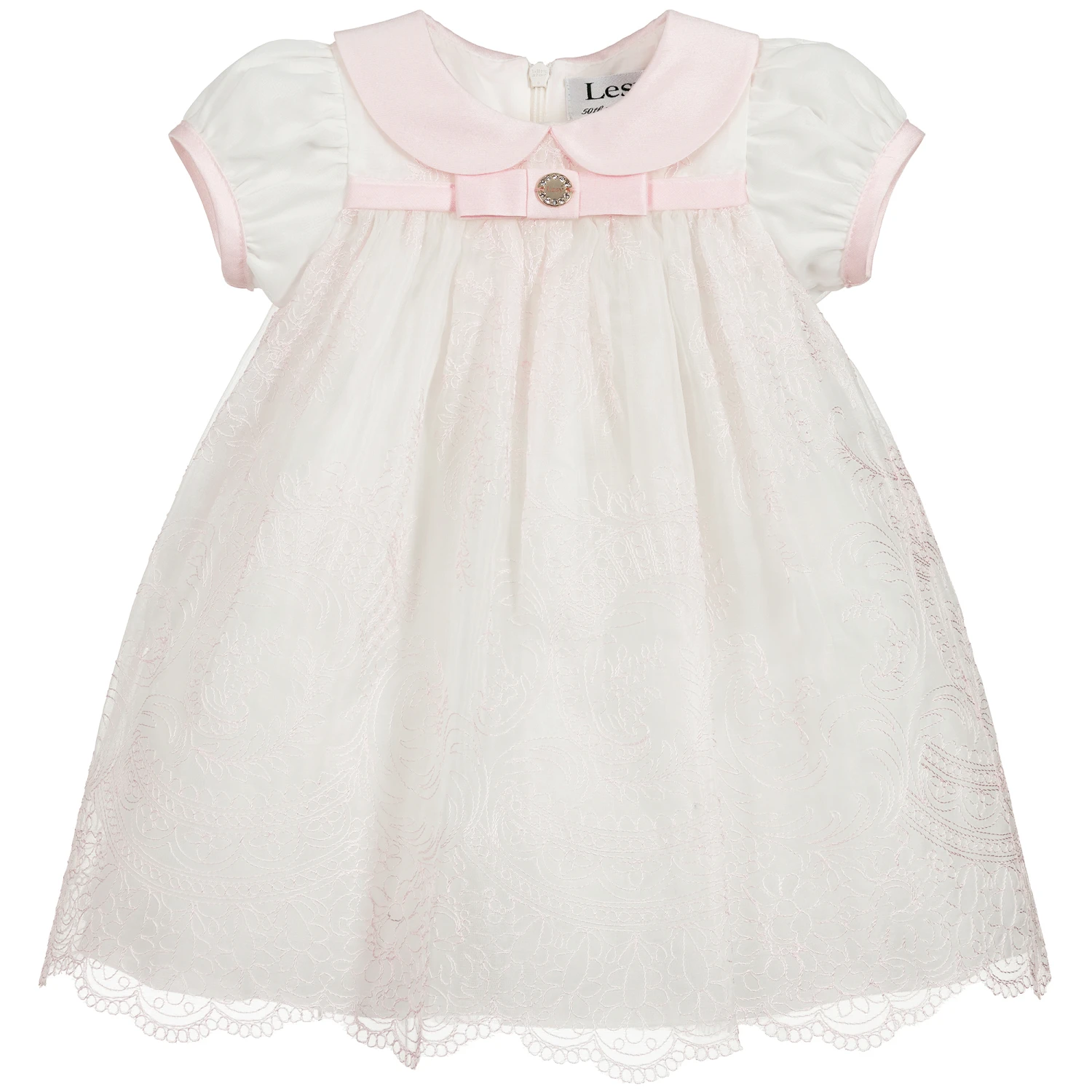 A beautiful white silk organza special occasion dress for little girls by luxury brand Lesy. It has delicate pink embroidery, pink collar and trim, with a golden diamanté logo. There is a tulle overlay on the puffed cotton sleeves. It has pretty scalloped hem, and soft cotton lining with tulle for extra volume.