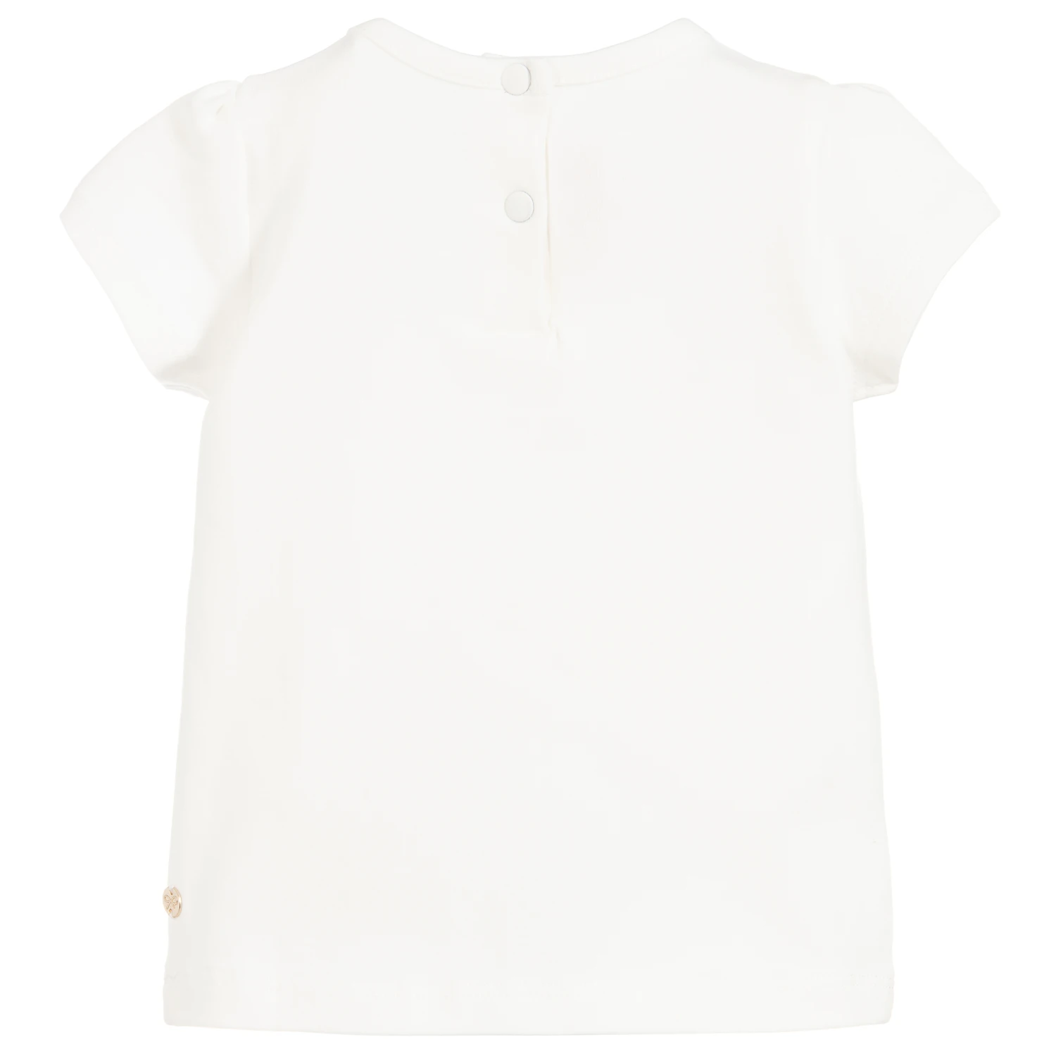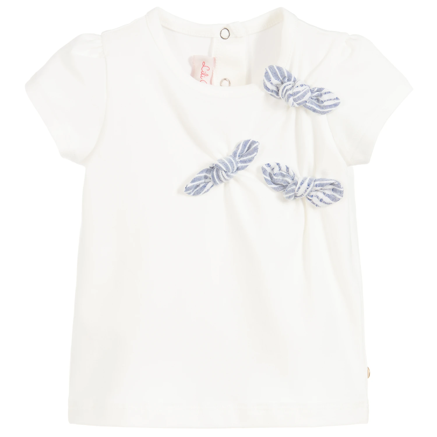Little girls white, comfortable cotton T-shirt with blue striped bows, by Lili Gaufrette.