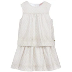 Designed by Lili Gaufrette, a pale gold dress for girls, made from soft cotton broderie anglaise. Sleeveless, it has a lightweight lining and fastens with pretty mother-of-pearl branded buttons on the back. This pretty dress has a layered look, with a slightly open back.