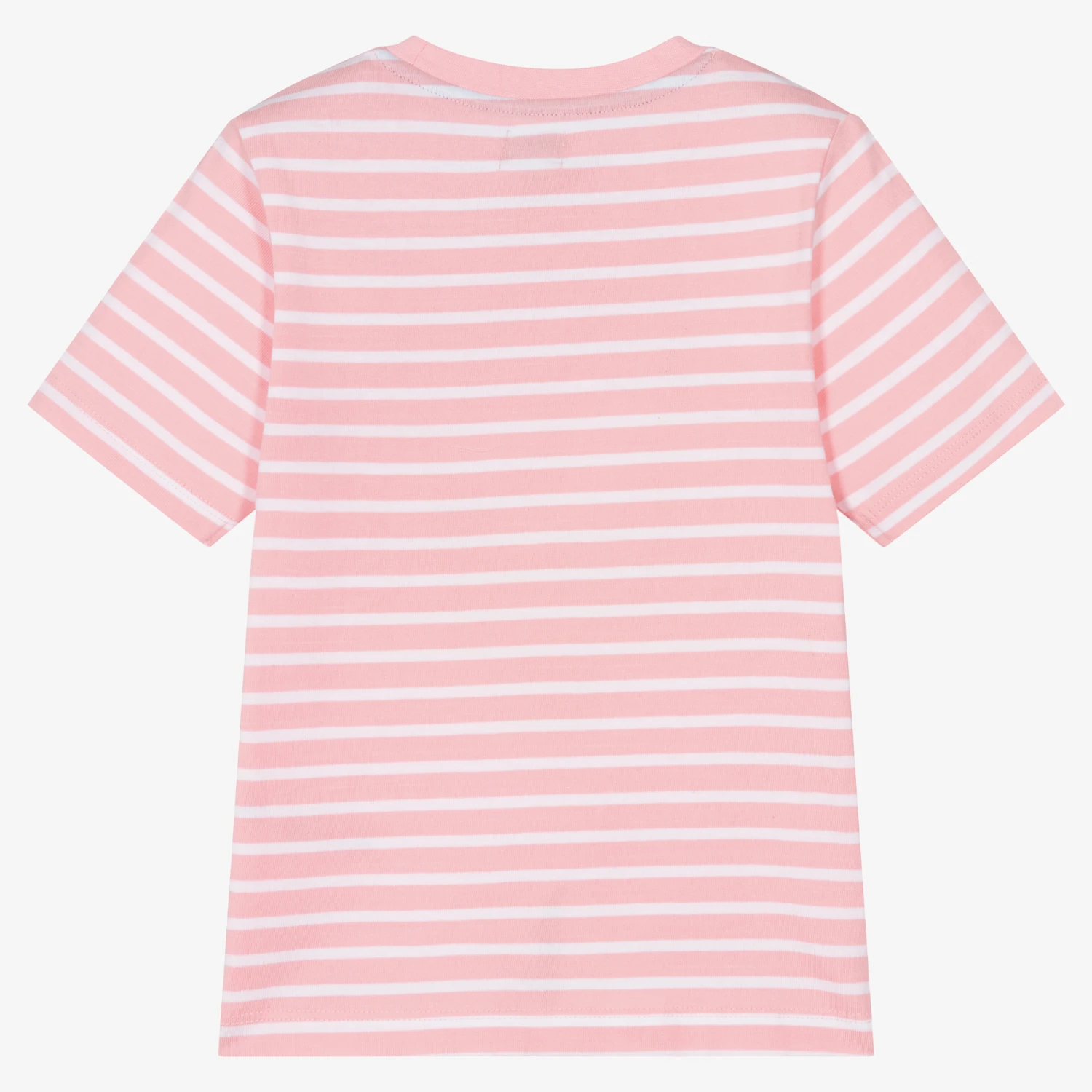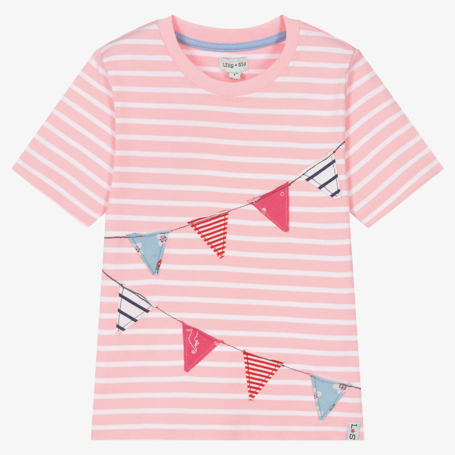 A lovely pink and white T-shirt for girls by Lilly and Sid, made from sustainable organic cotton jersey. This super soft tee has a striped pattern, with assorted buntings stitched on the front and a logo tab on the hem.