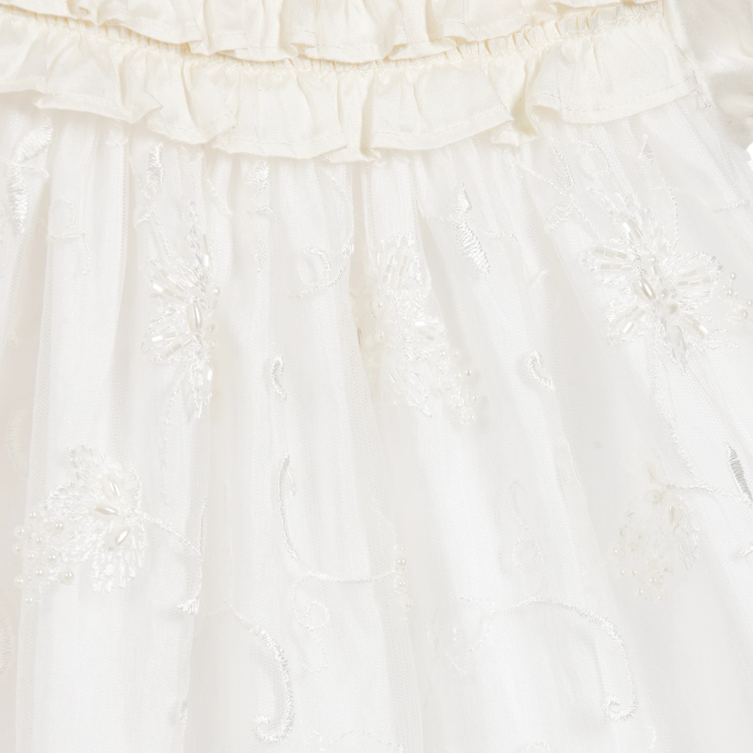 Gorgeous ivory silk three-piece Ceremony outfit by Little Darlings Occasion. Designed for baby girls, the set has a beautiful dress with a fitted ruffle bodice and capped short sleeves, with matching knickers and hat. The tulle overlay is embroidered with a delicate floral design with sequins and beads and has a scalloped edge and does up at the back with silk covered buttons. The knickers are made in pure silk and have an elasticated waistband and leg holes with ruffle trims.