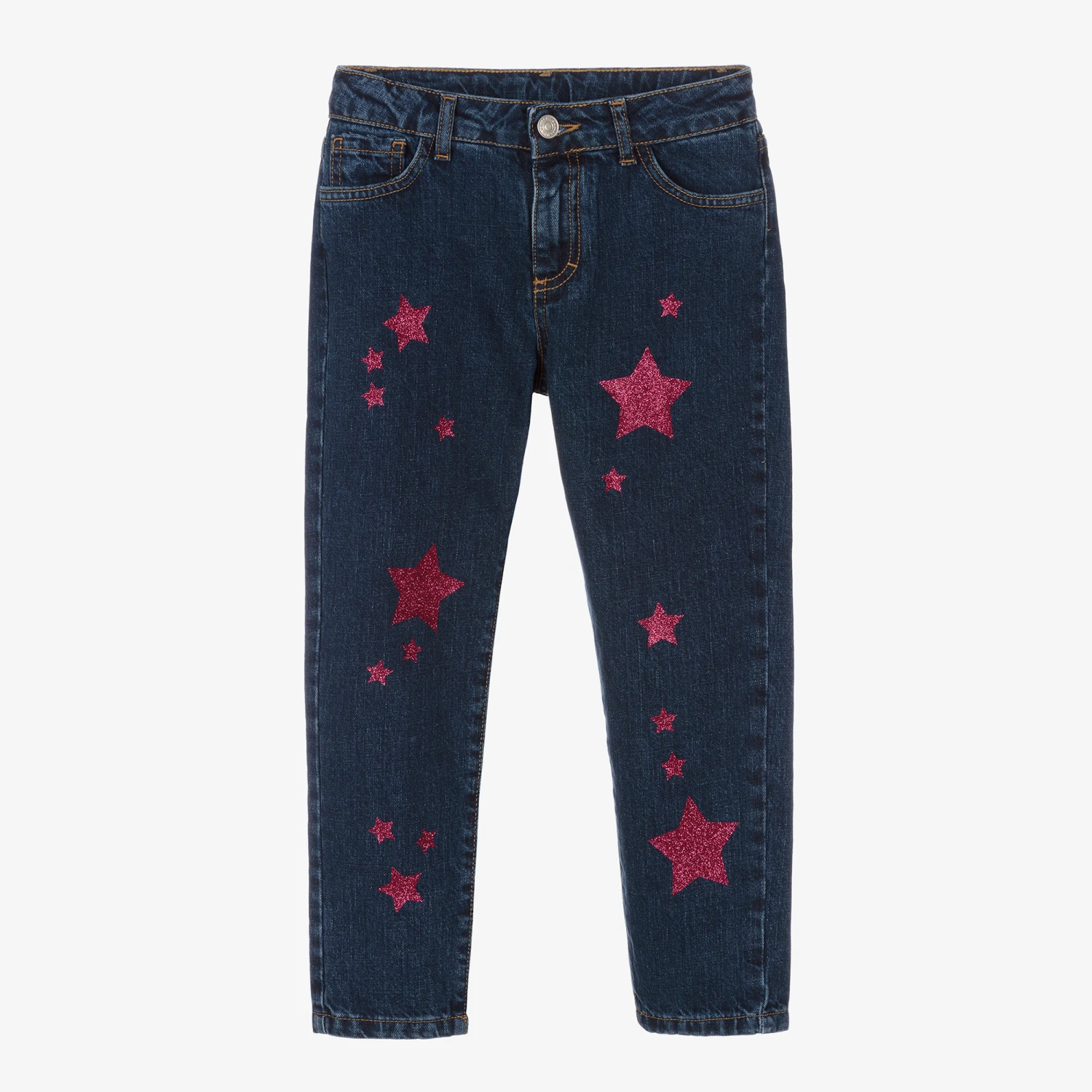 Girls dark blue, regular fit jeans from Marc Ellis, patterned with pink glitter stars on the front. A classic five-pocket style, they are made in soft cotton denim with zip and branded button fastening. The waistband is adjustable for a comfortable fit.