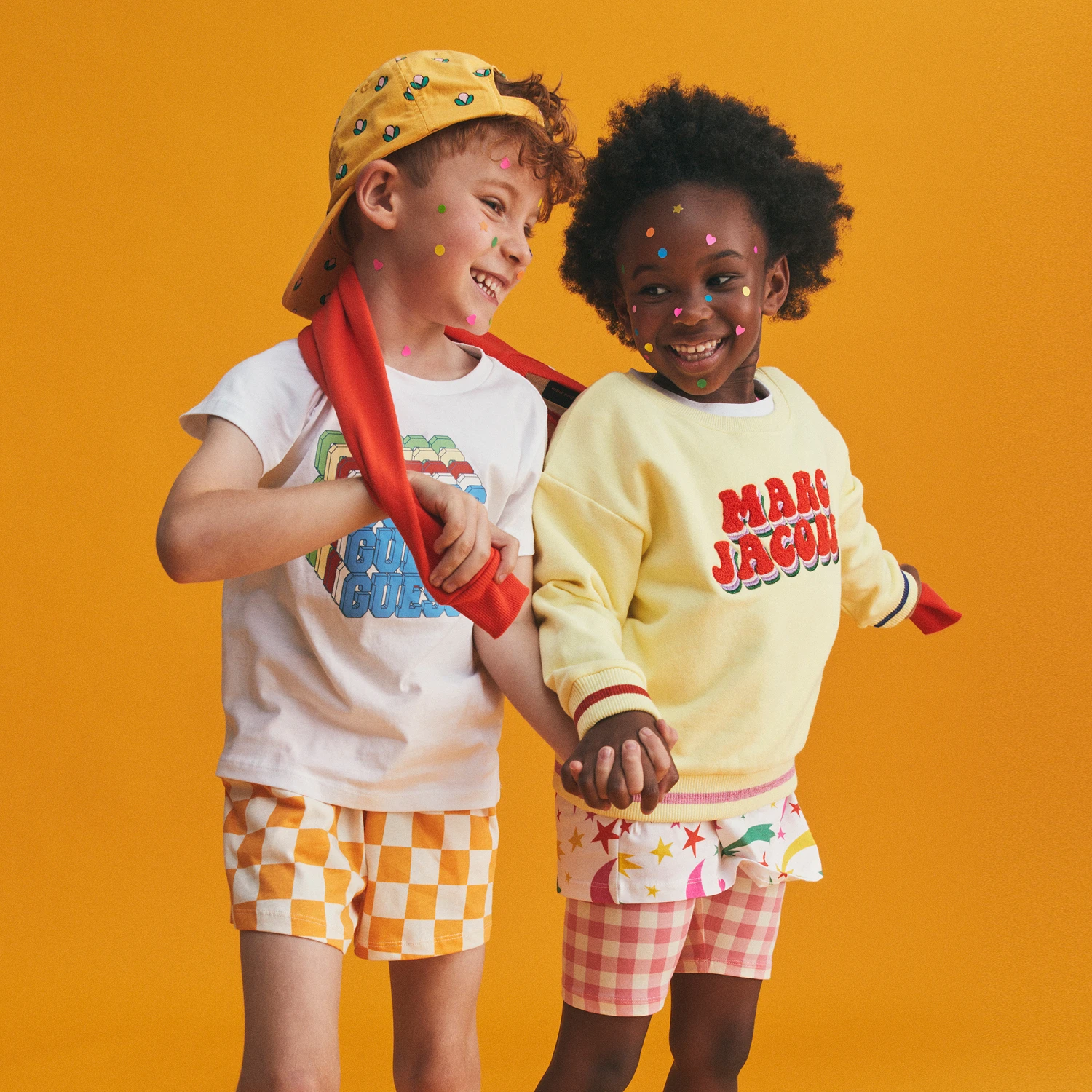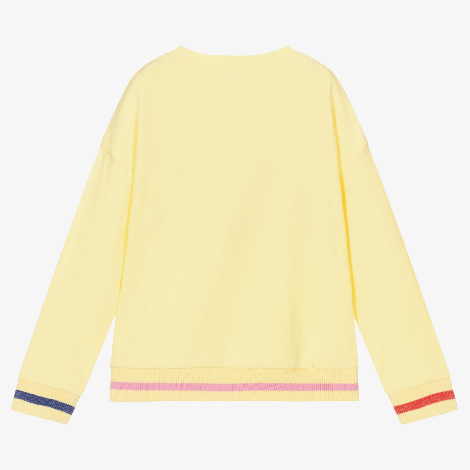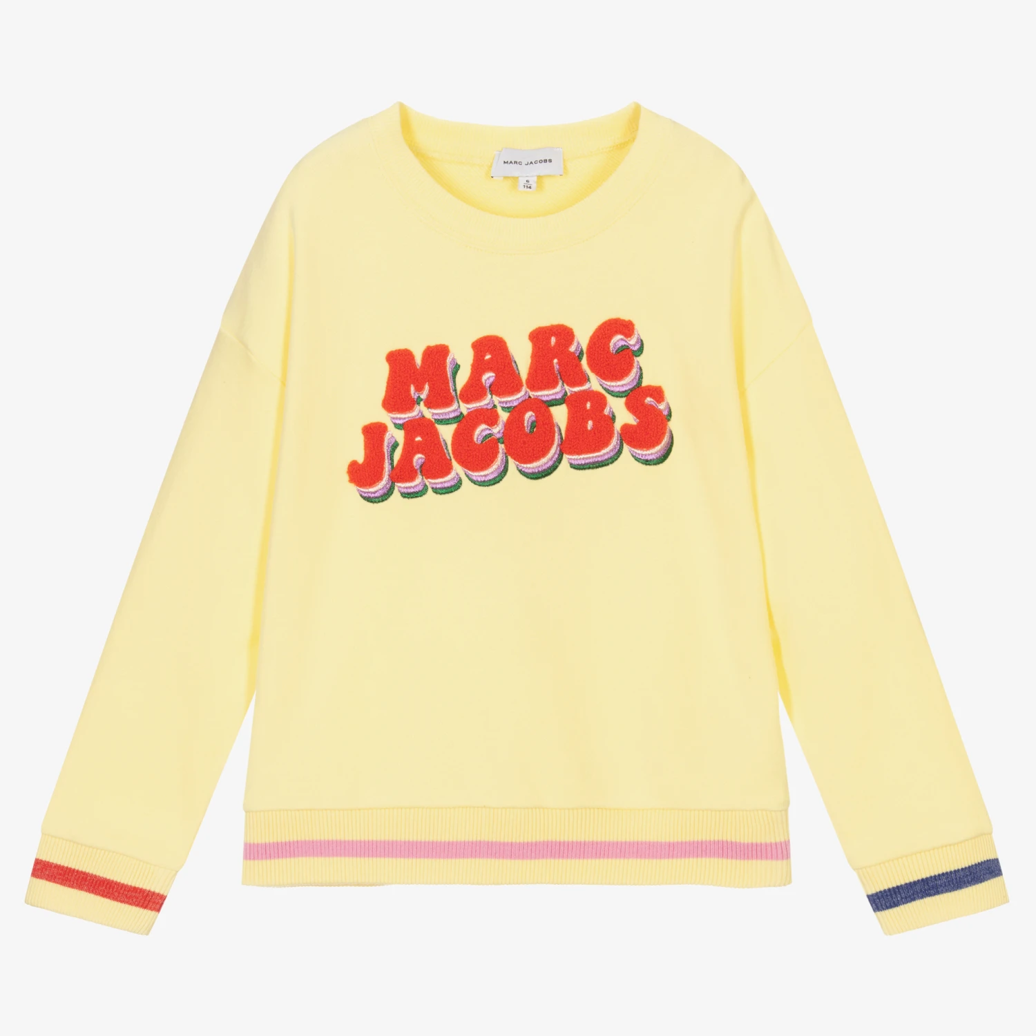 Girls bright yellow sweatshirt by MARC JACOBS, made in soft, mid-weight jersey. The front has a 3D raised towelling logo on the front in red, with purple and silver metallic embroidery.