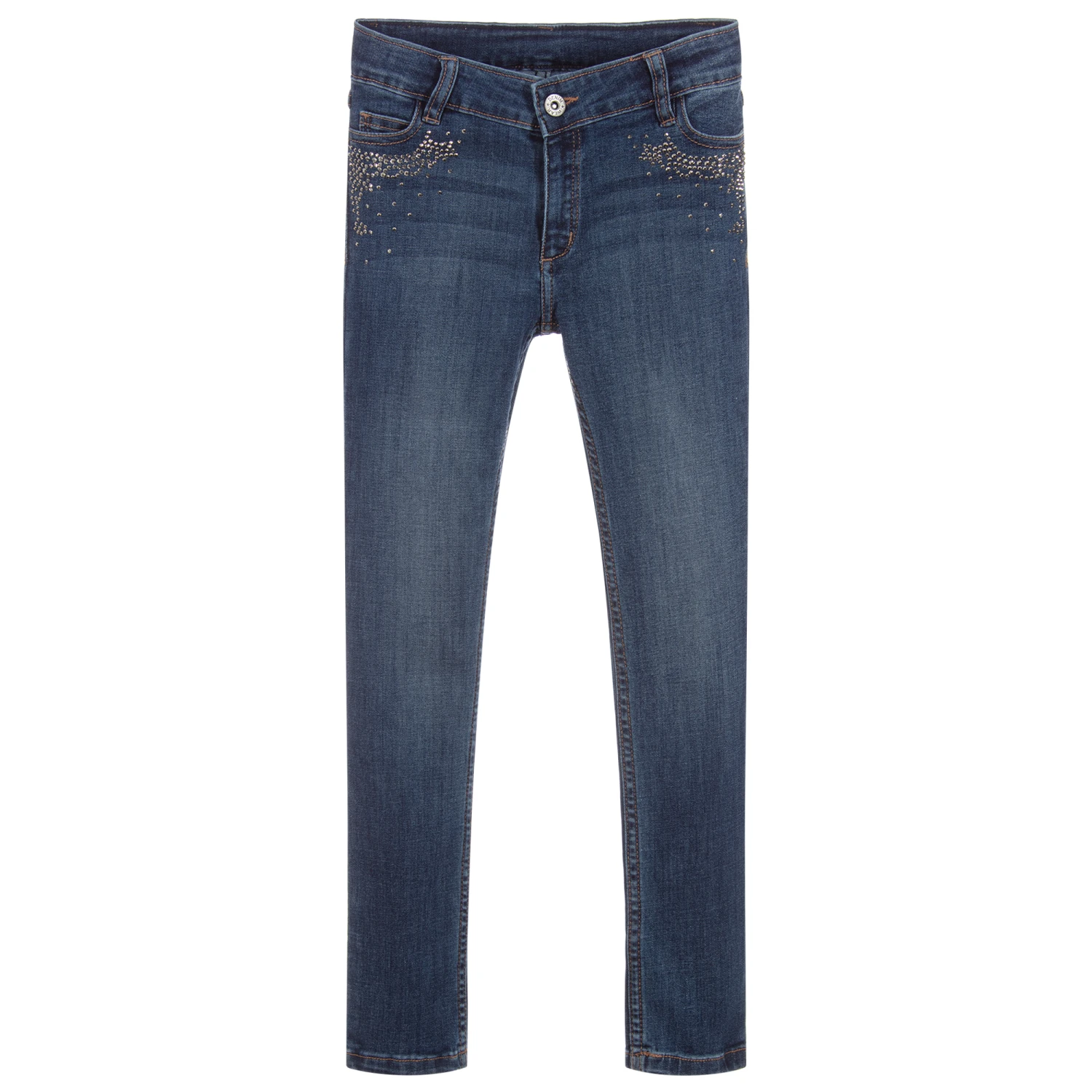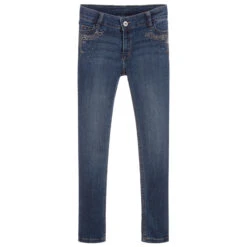With a washed and worn look, these girls jeans are by Mayoral. Made in slightly stretchy cotton denim, they have a skinny fit and a useful, adjustable waistband. Sparkling diamantés are scattered below the front pockets.