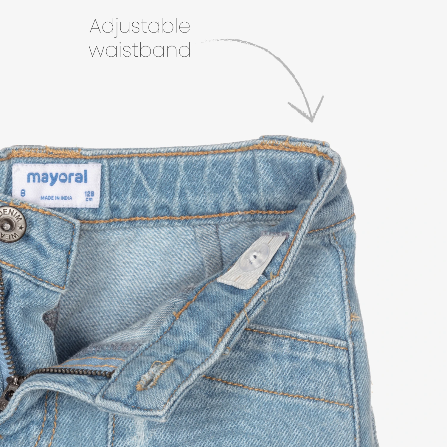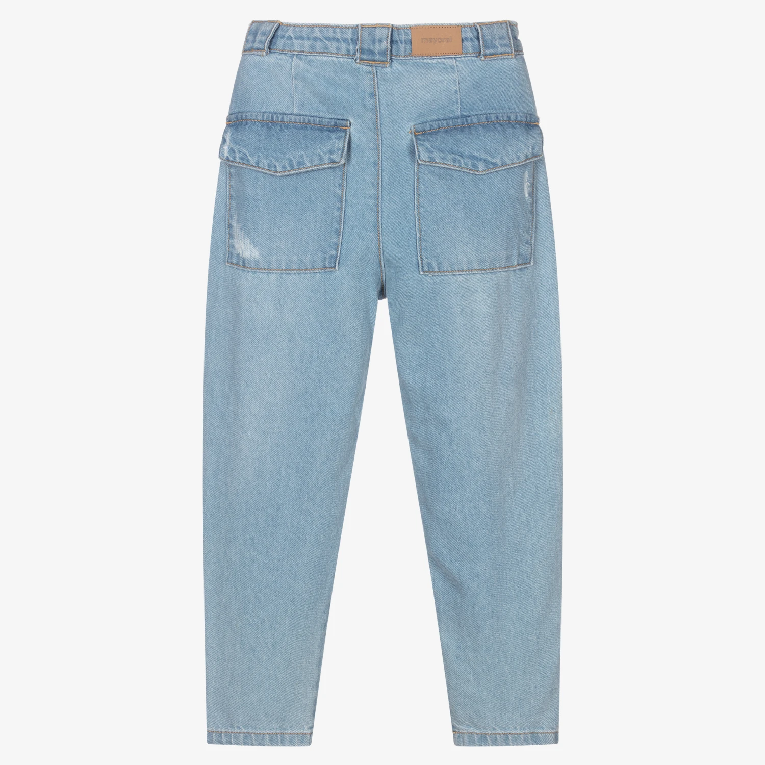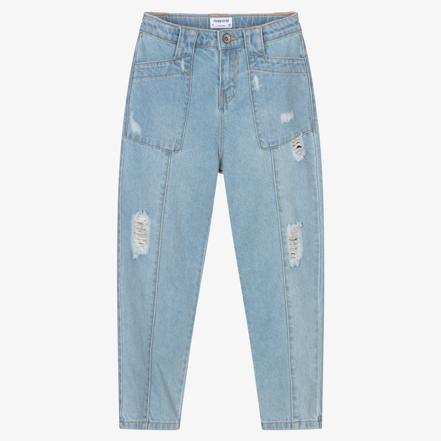Light blue wash jeans for girls by Mayoral, made in soft mid-weight cotton denim. In a slouchy fit with a high waist, they have cool distressed details and a brown faux leather badge on the back of the waist.