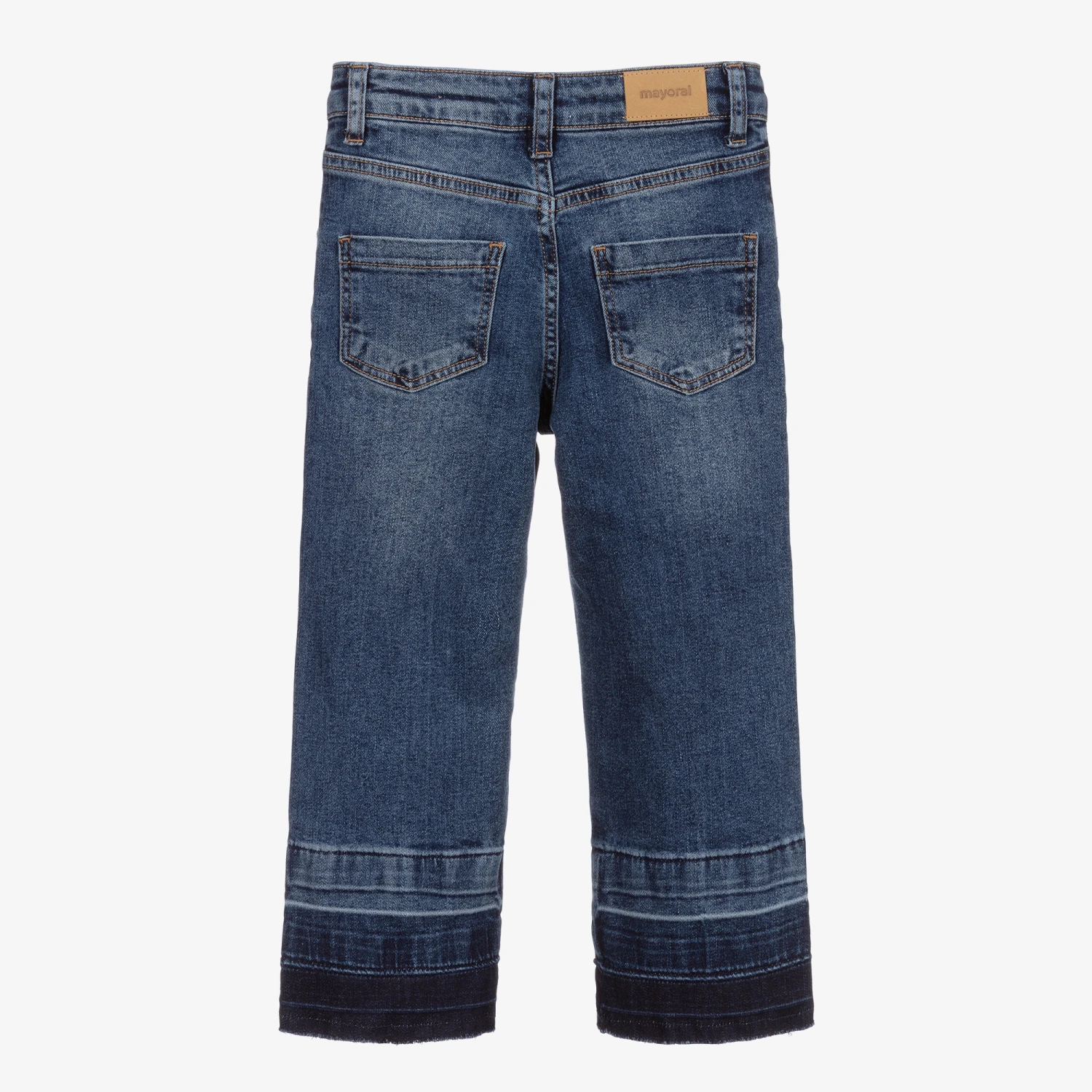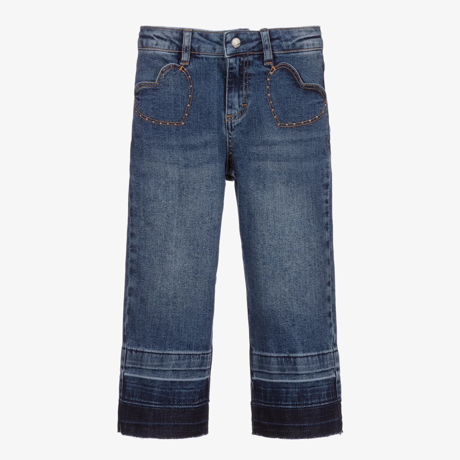 Girls blue straight fit jeans from Mayoral, made in stretchy denim with faded and distressed details. They have heart-shaped patch pockets with gold studs on the front and a comfortable adjustable waistband. They come with a beige and black animal print belt.