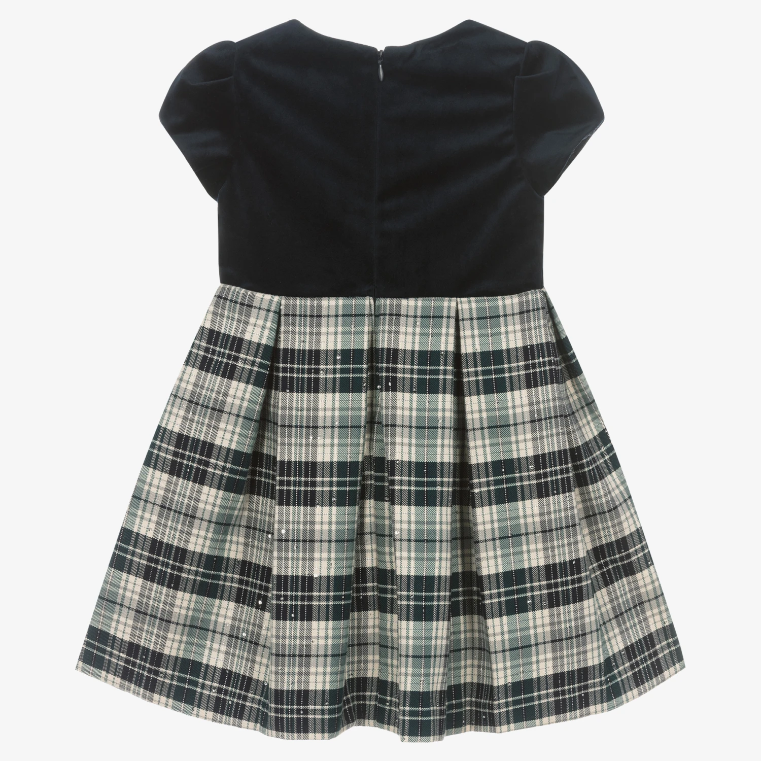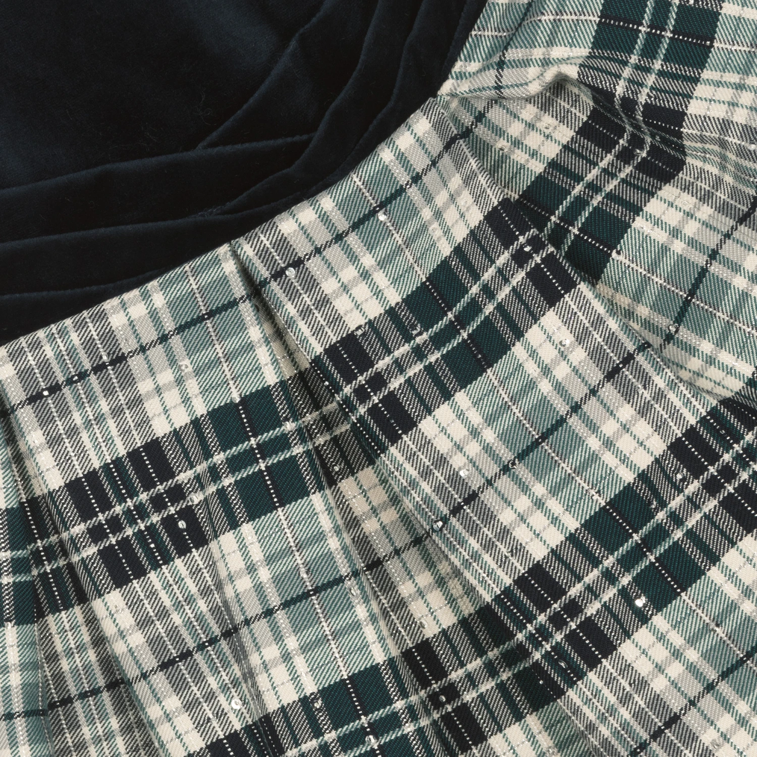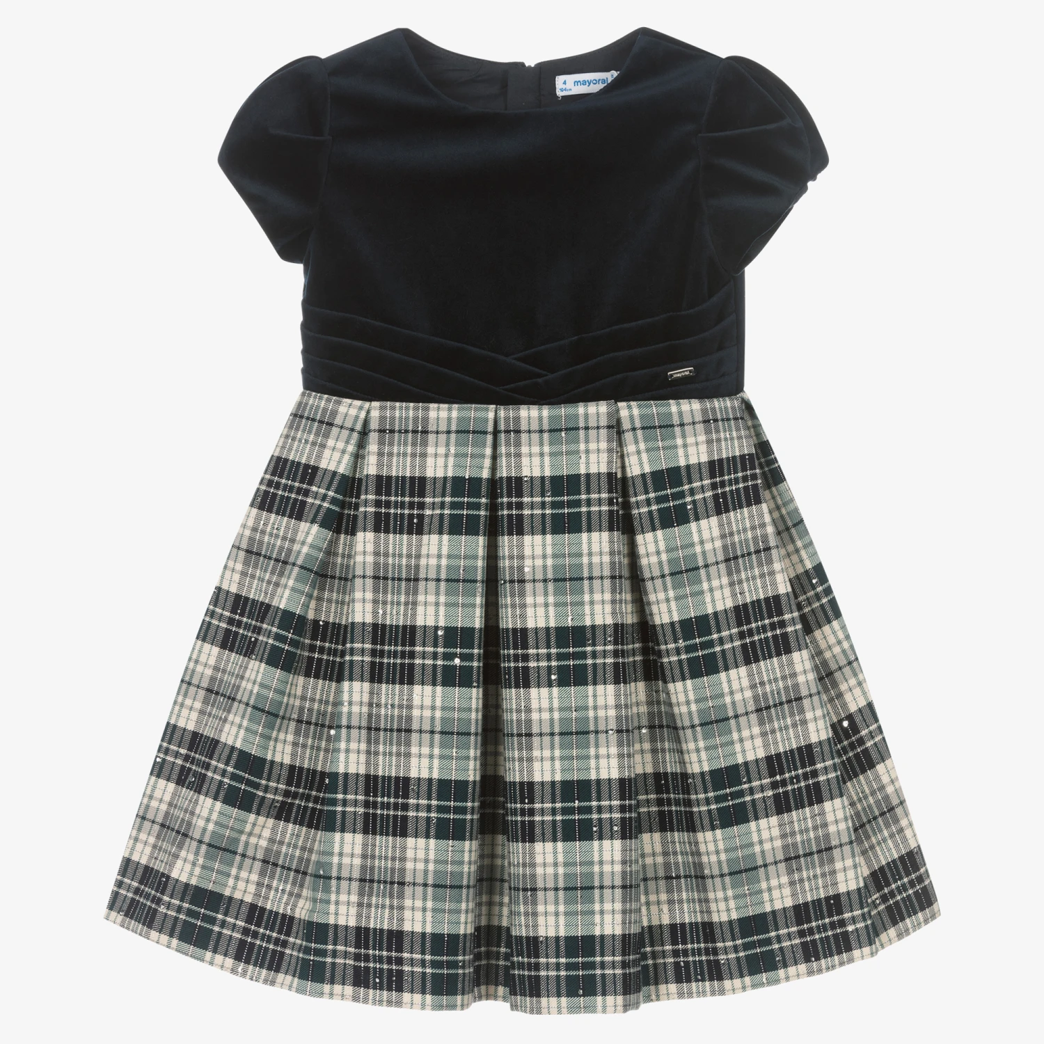 Navy blue special occasion dress for girls by Mayoral. The navy blue velvet bodice has puffed sleeves with pleated detailing on the waist and a silver metal logo plate on the front. The green, ivory and navy blue pleated tartan skirt has a glittery silver thread in the weave and is scattered with shiny sequins on older sizes. The dress has a lightweight lining for comfort and fastens with a concealed zip on the back.