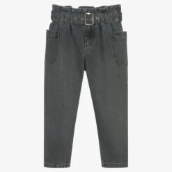 Lovely slouchy-fit jeans for girls, by Mayoral, in a gorgeous dark grey shade. Made in soft sustainable cotton denim, these cute jeans have a stylish removable belt, side pockets, and a paper-bag adjustable waist to alter as your child grows.