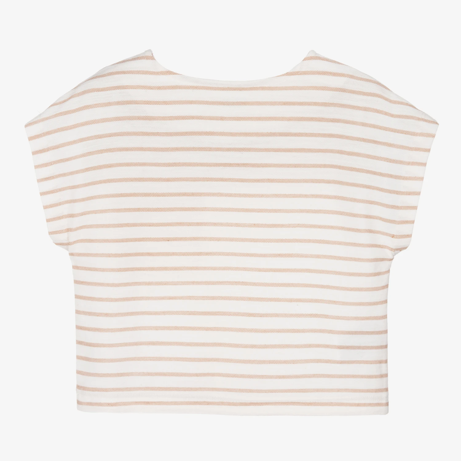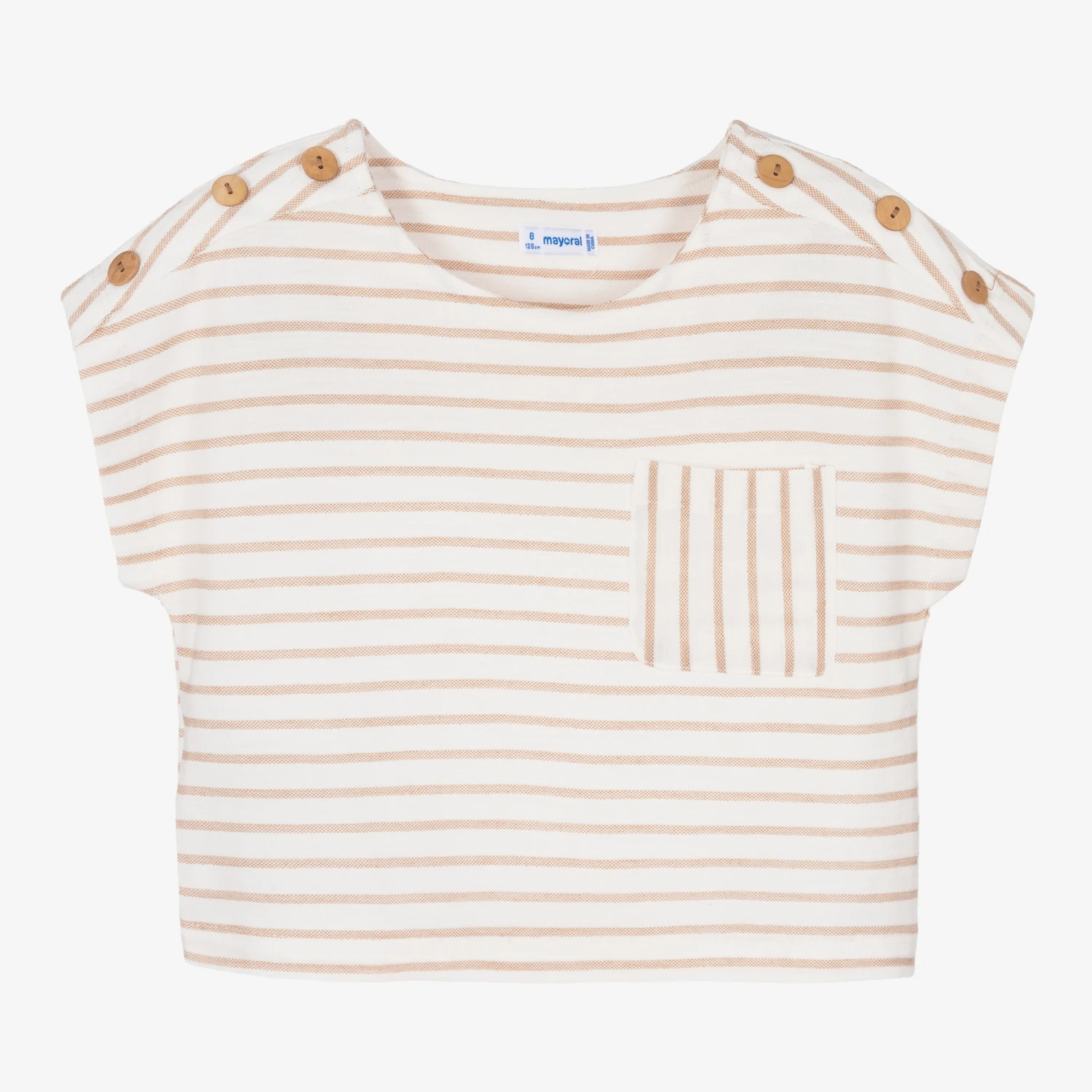 Ivory and beige striped T-shirt for girls by Mayoral, made in soft and lightweight cotton jersey. Cool and comfortable, this stylish boxy fit top has wooden button trims on the shoulders and a patch pocket on the front.