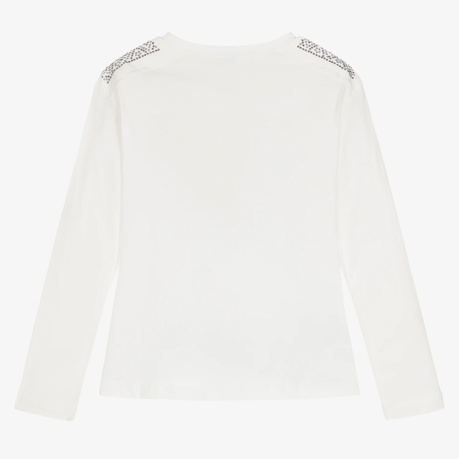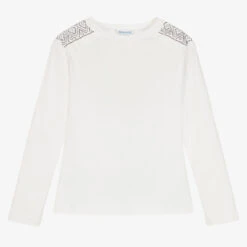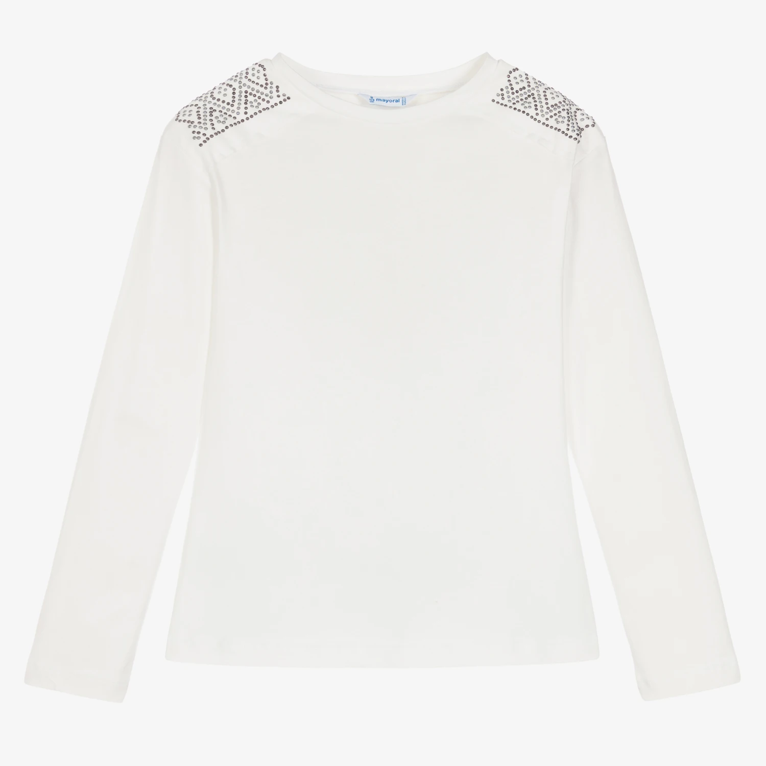 Ivory top for girls by Mayoral, made in soft and comfortable cotton jersey. The shoulders have raw-edge panels, decorated in a lovely black and silver beaded design.