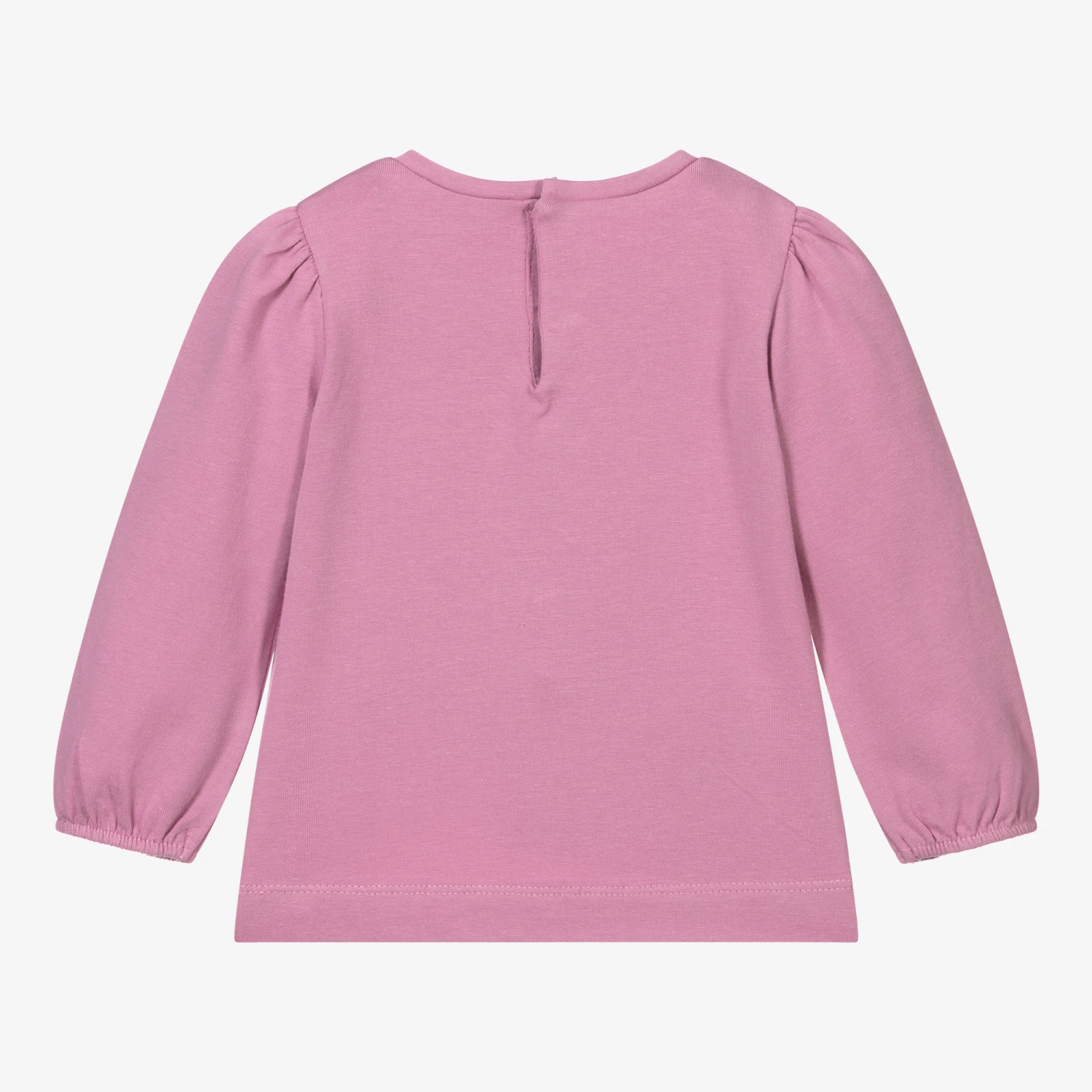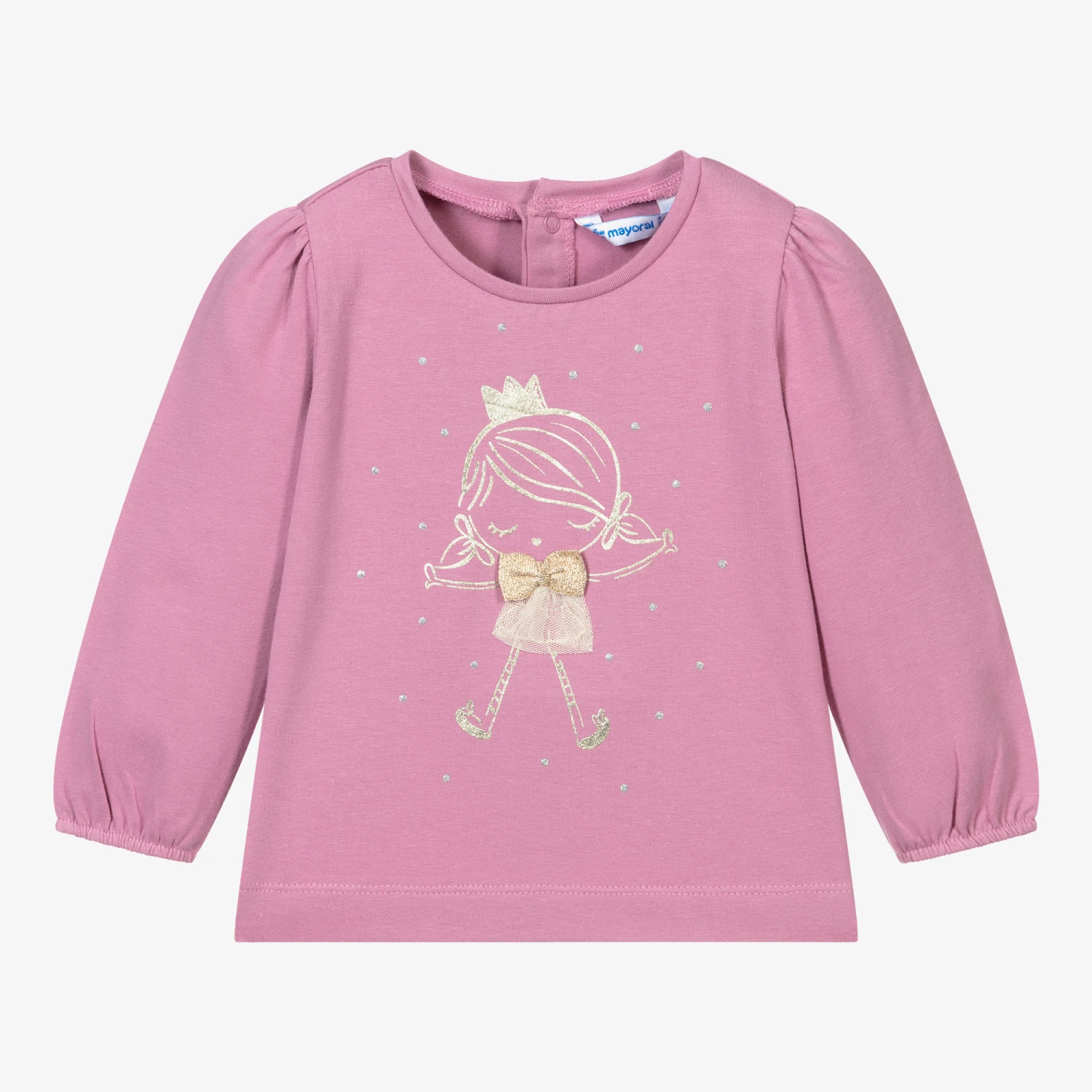 Pink top for younger girls by Mayoral. It has a girl printed in gold on the front wearing a sparkly tulle skirt and a shiny bow, surrounded by glittery silver dots. Made in comfortable, sustainable cotton jersey, it has puffed sleeves and elasticated cuffs.