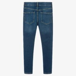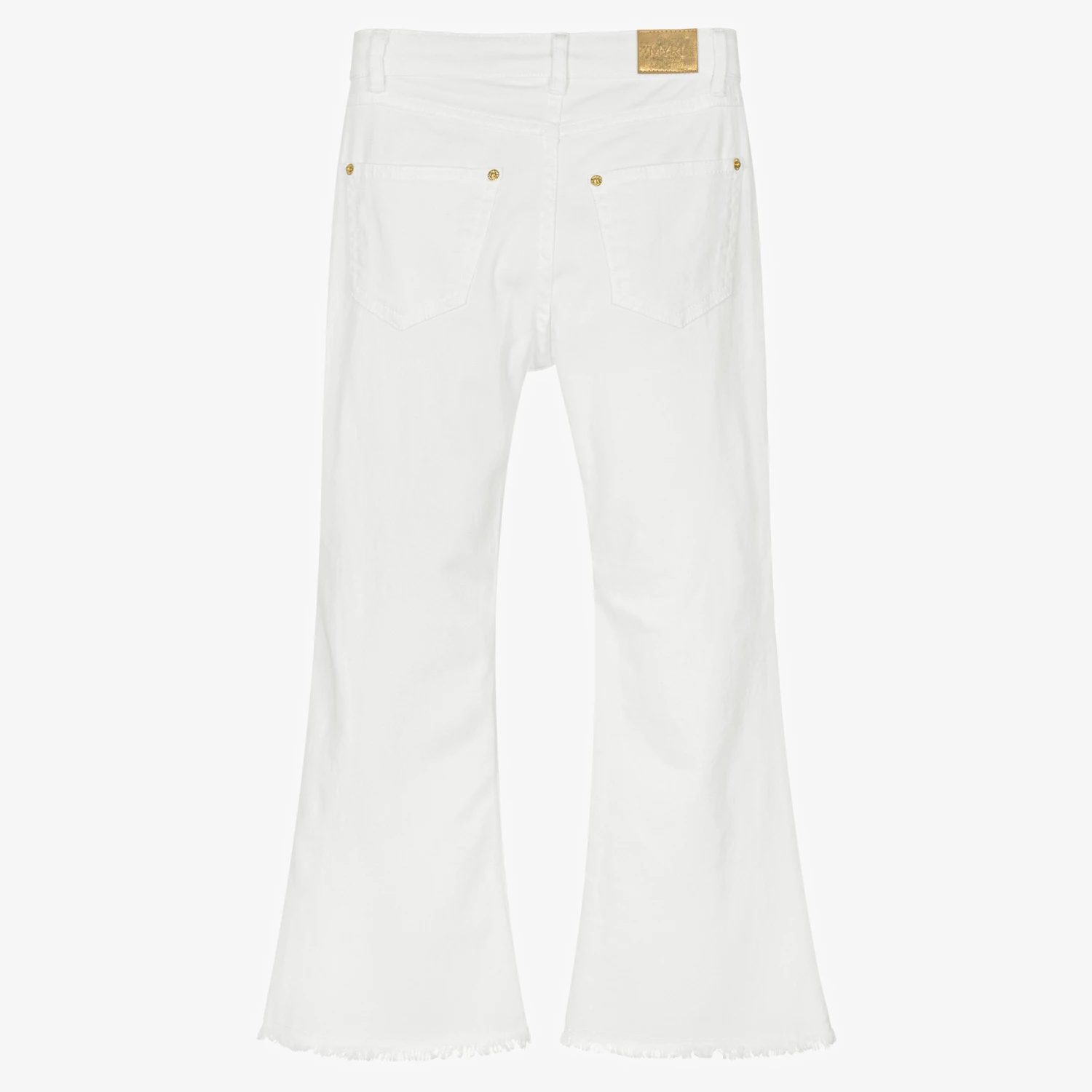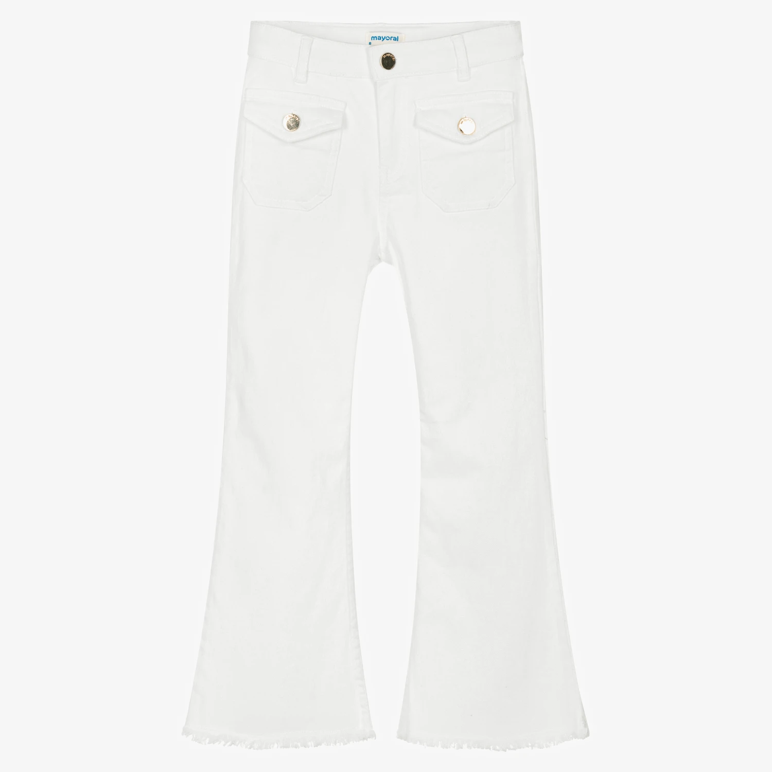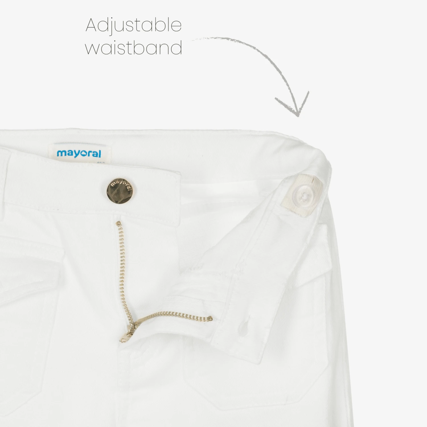 Girls stylish white jeans from Mayoral, made in soft cotton denim with a slight stretch for comfort. Button-fastening patch pockets on the front give a modern twist and they have cool frayed hems. To complete the look they have branded gold metal hardware and a gold logo patch on the back, and the waistband is adjustable for a great fit. Made with sustainable cotton.