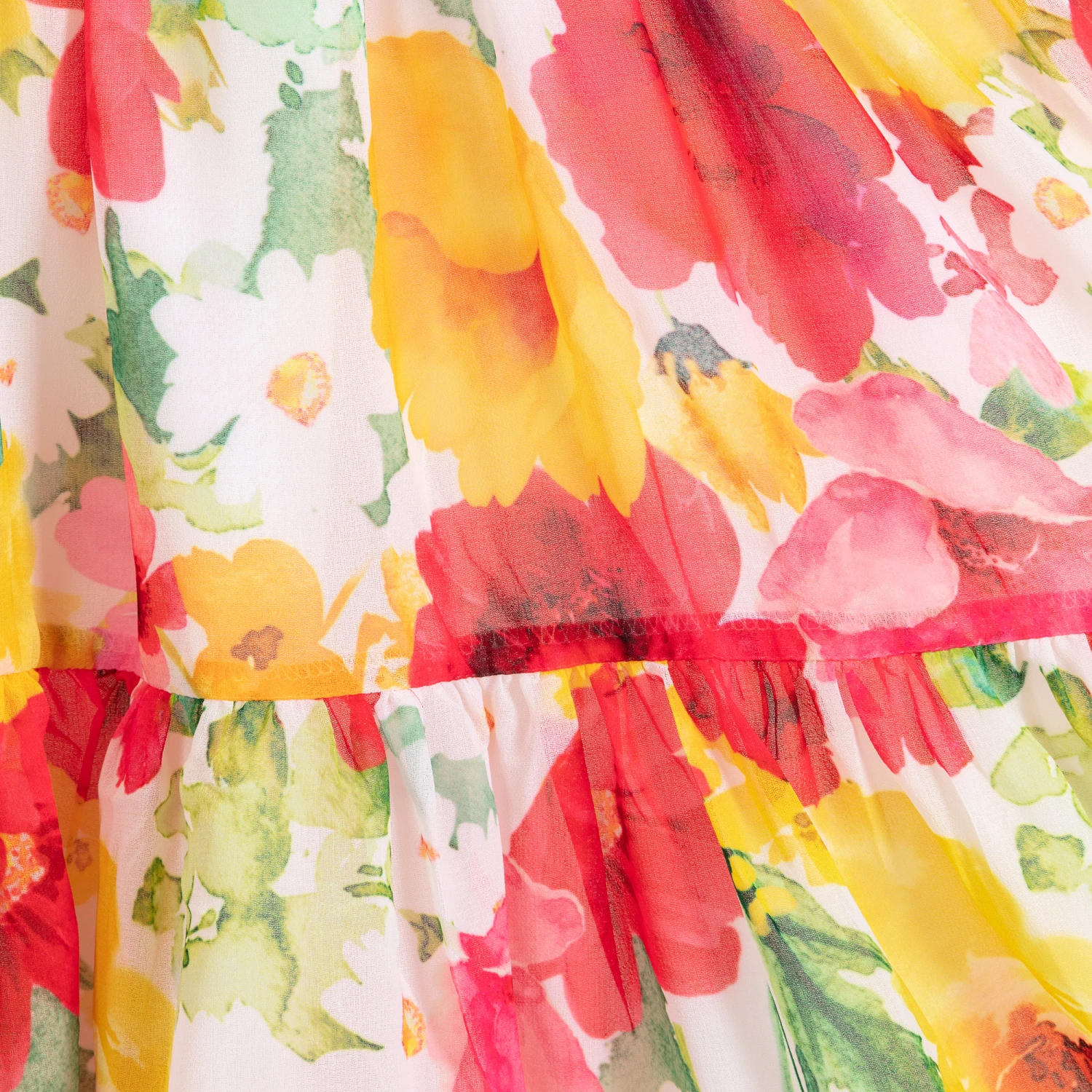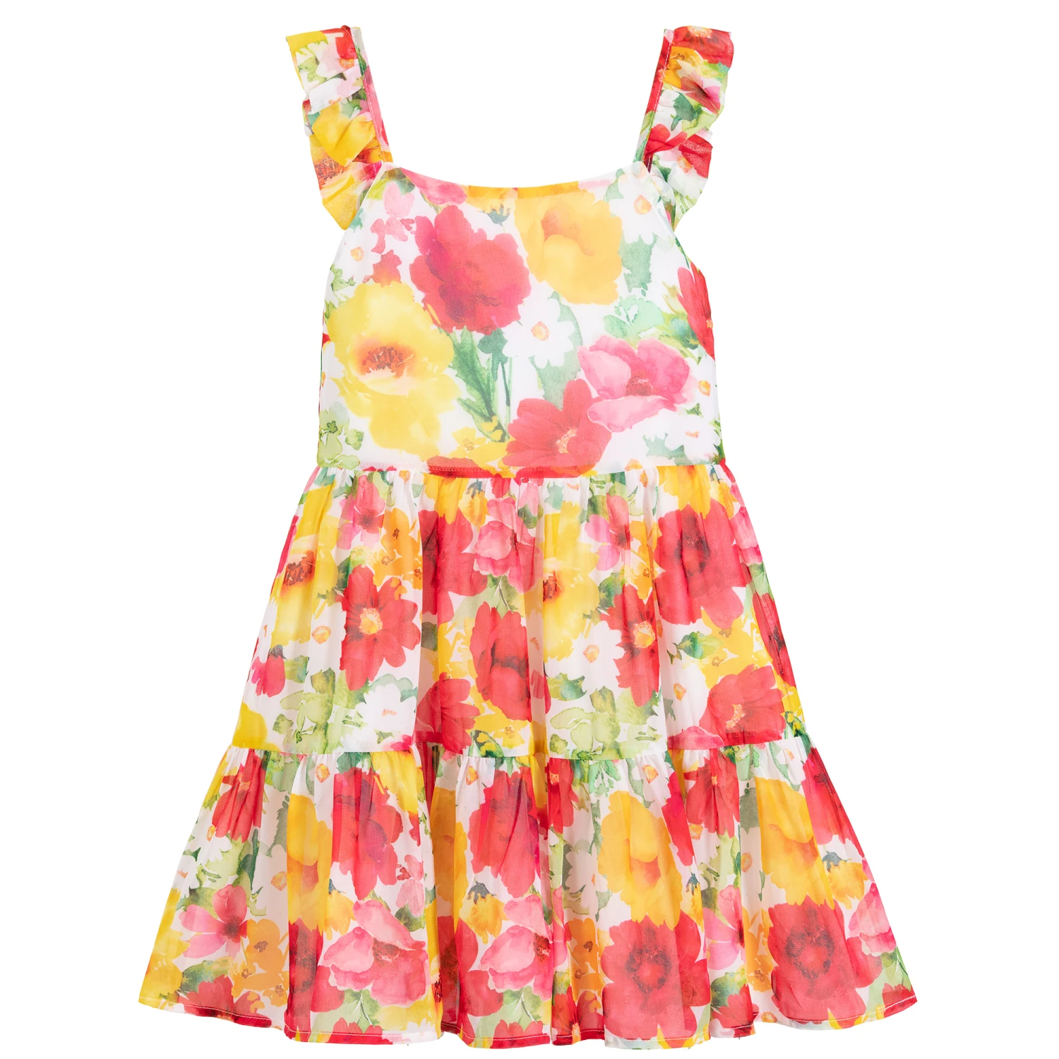Girls pretty chiffon dress by Mayoral, with a red and yellow floral print on an ivory background. It has an open back with an adjustable fabric tie, and is fully lined in soft polycotton.