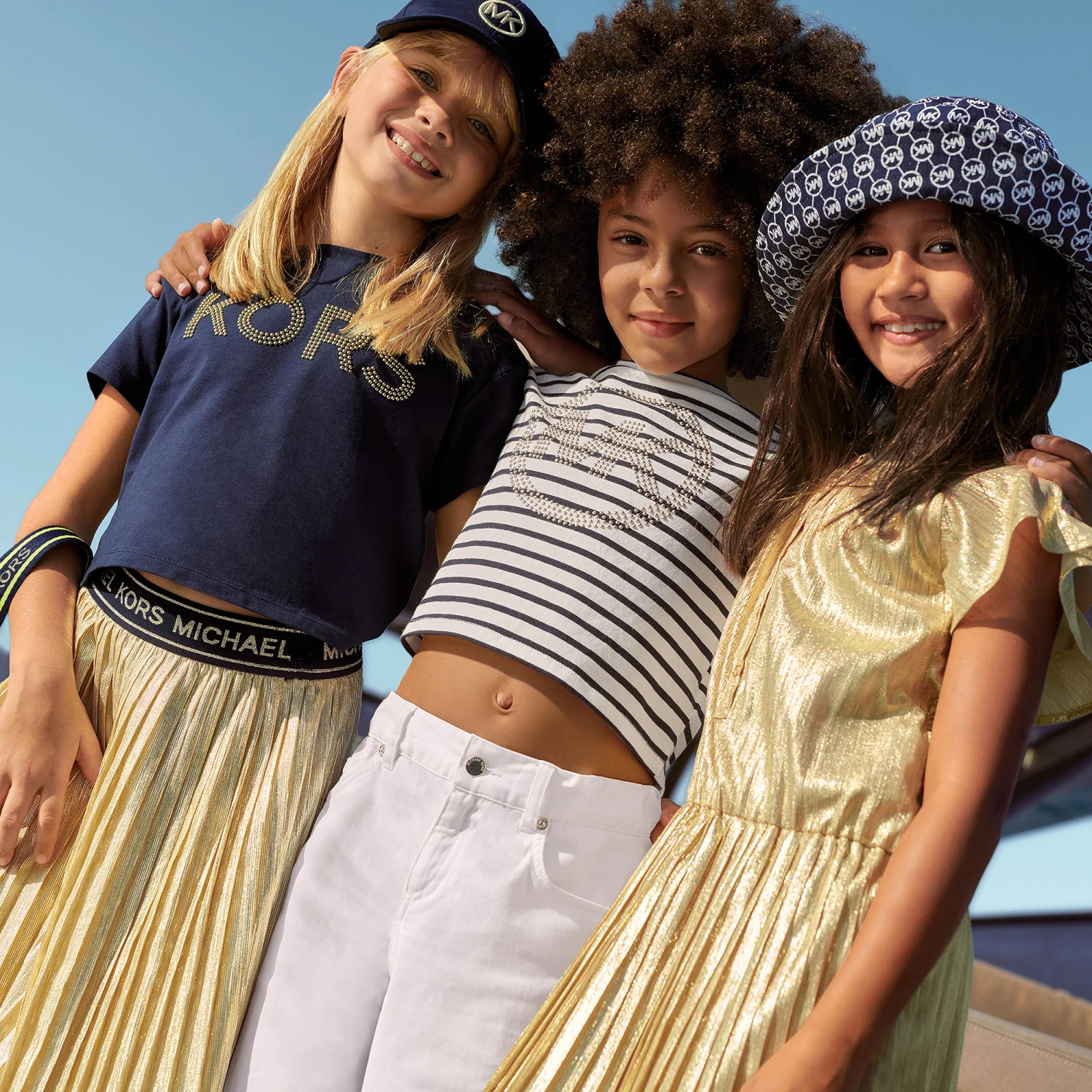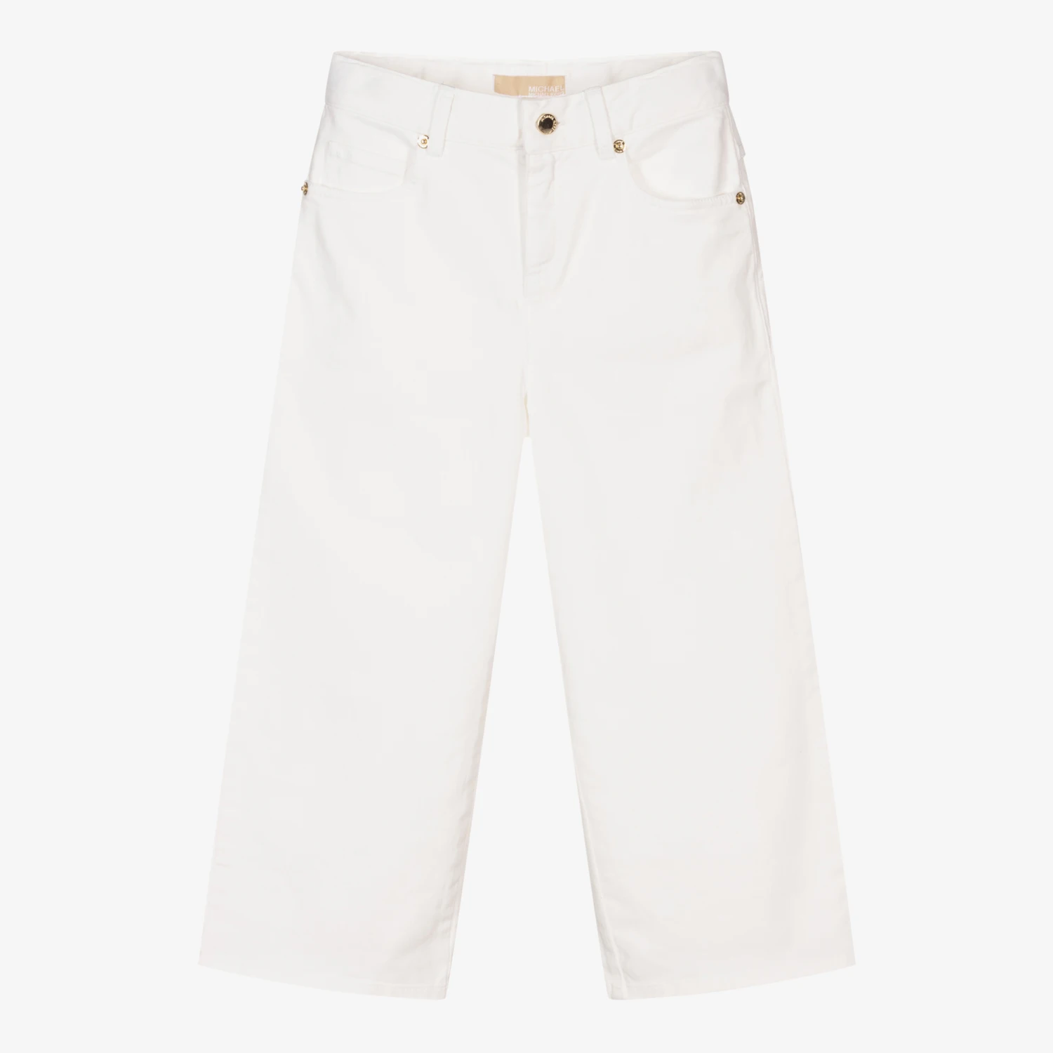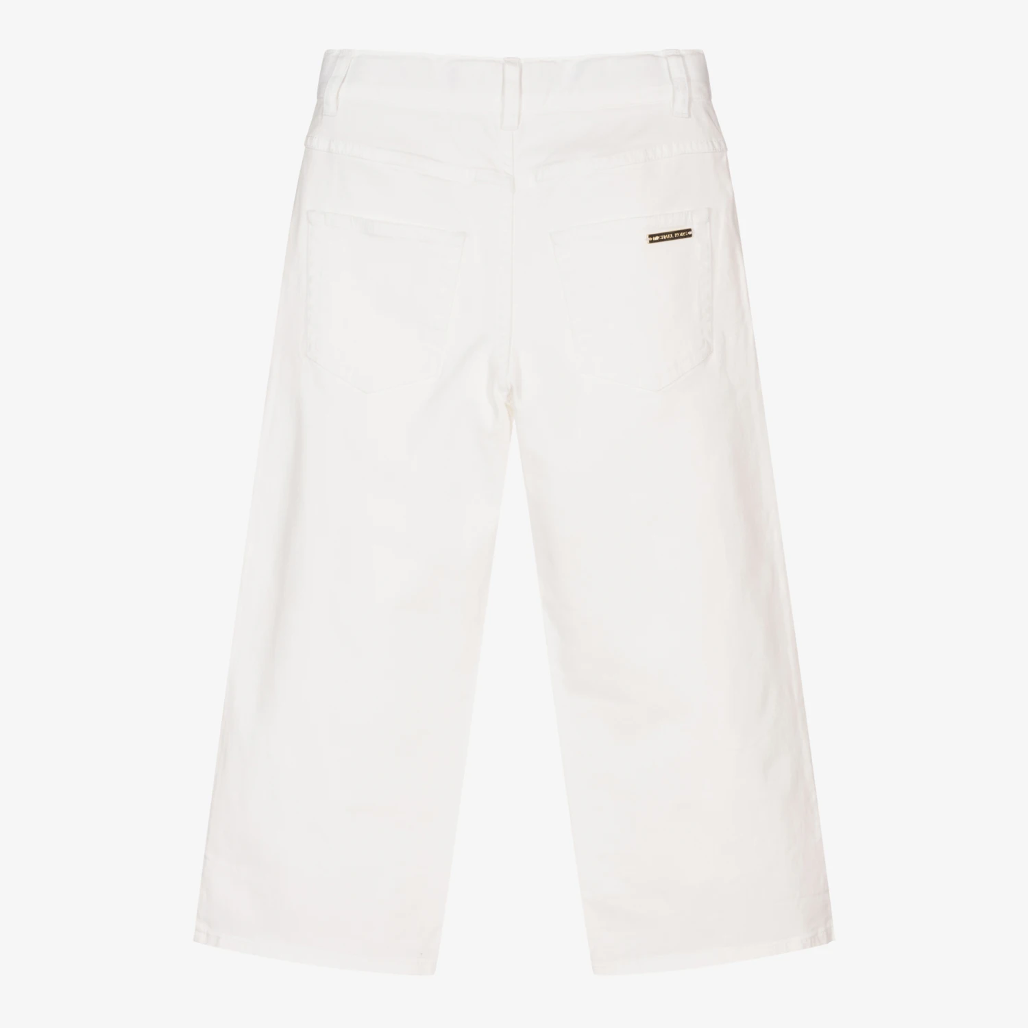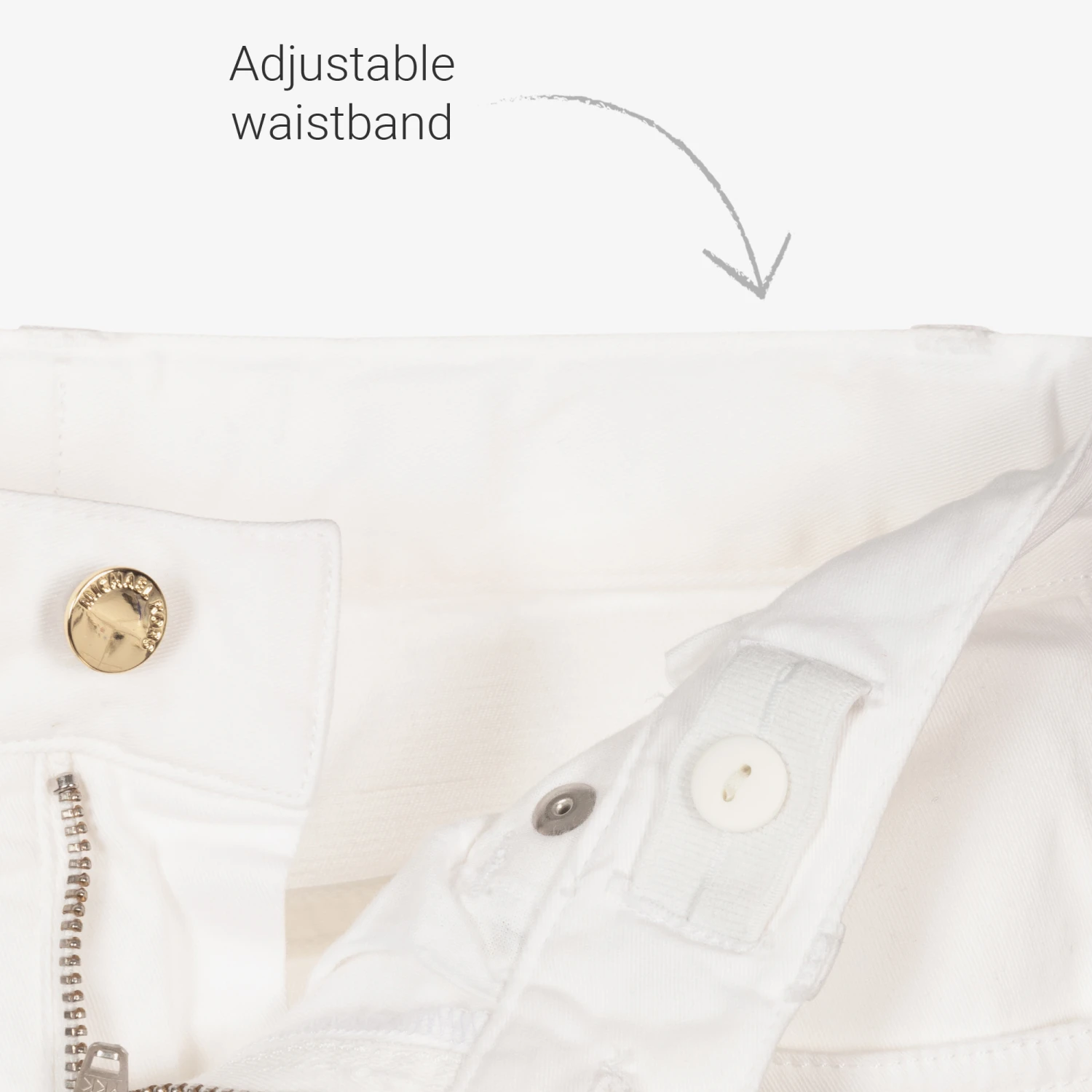 White jeans for girls by luxury American designer Michael Kors. Made in soft, lightweight cotton twill, they are wide-fitting and have a shiny gold logo button fastening on the useful adjustable waistband. There are matching shiny gold rivets on the front and a gold logo tab on one of the back pockets.
