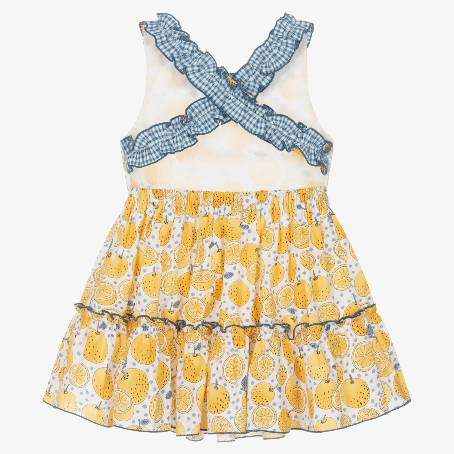Girls pretty yellow and blue print dress by Spanish brand, Miranda. Made in smooth cotton poplin, the dress has a bright and cheerful lemons print with blue and white gingham check trims. It has cross-over ruffle straps on the back that fasten with buttons and a matching ruffle collar for a feminine look.
