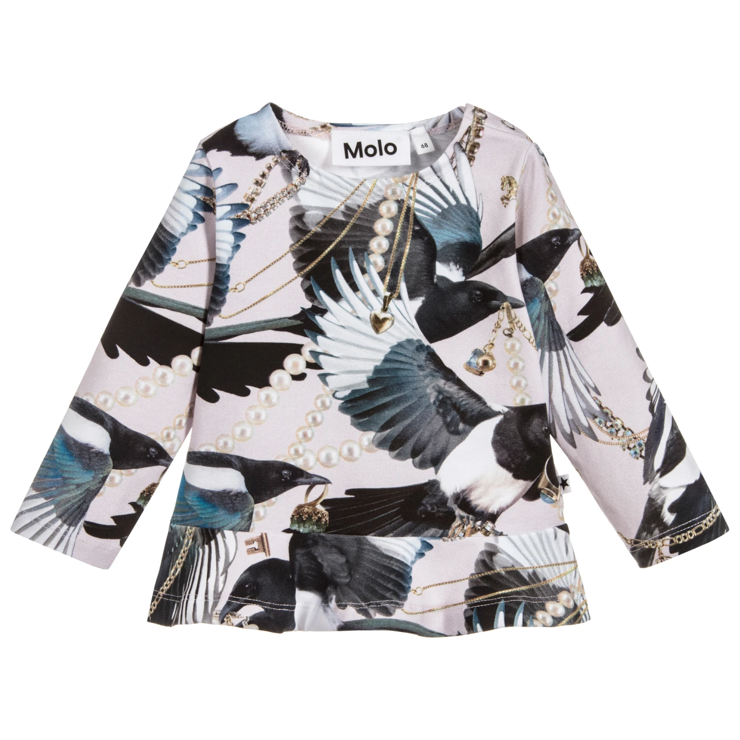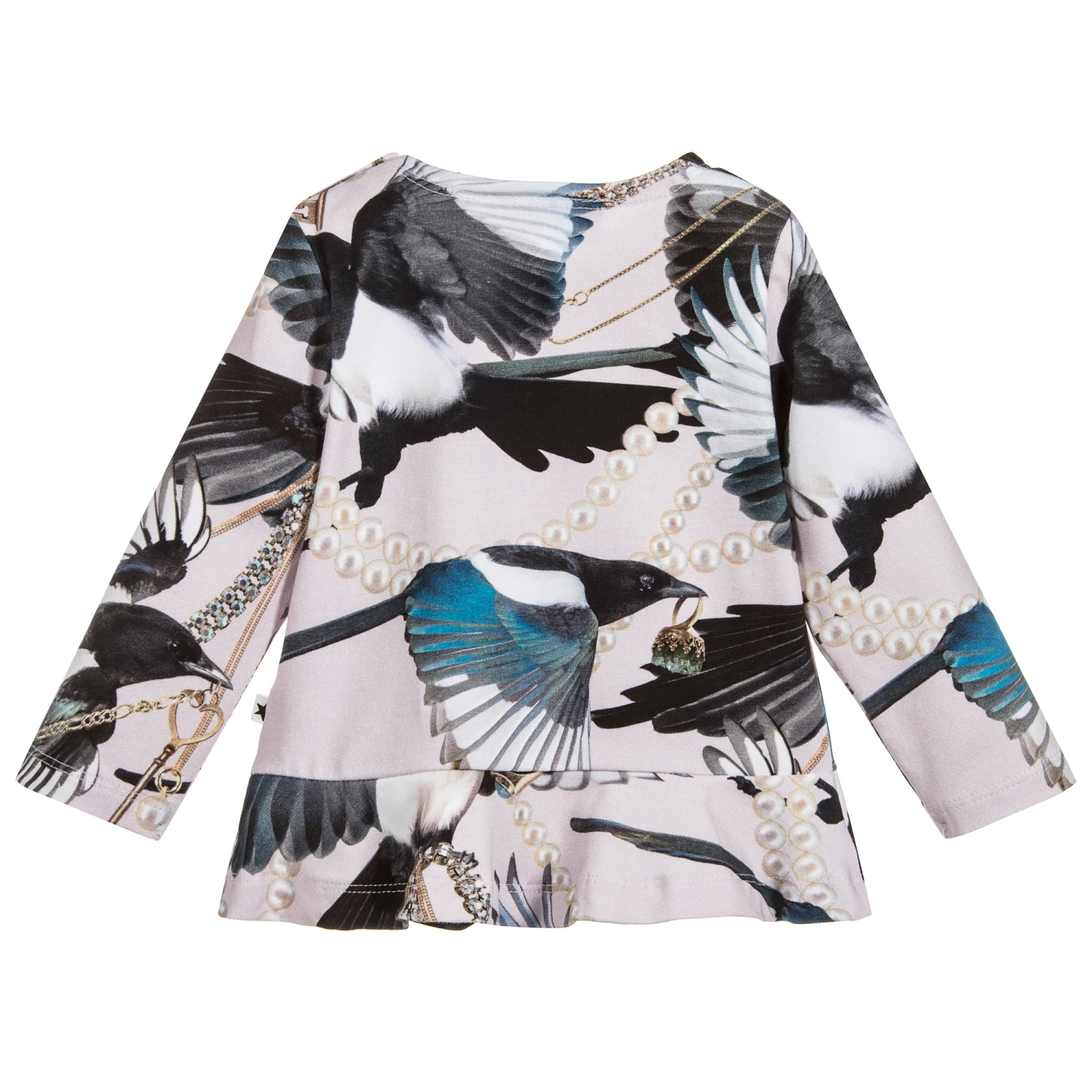 A soft and stretchy long sleeve top for baby girls by Molo, with a magpie and jewellery print. Made in cotton jersey, it has a fitted silhouette with a peplum style hem.
