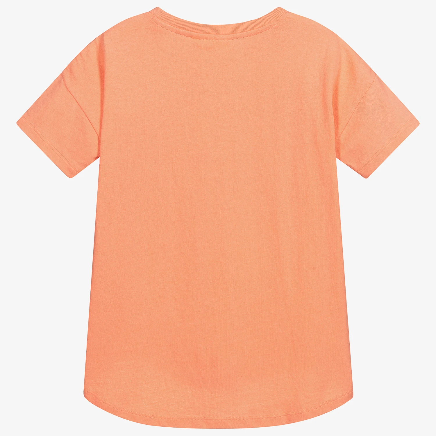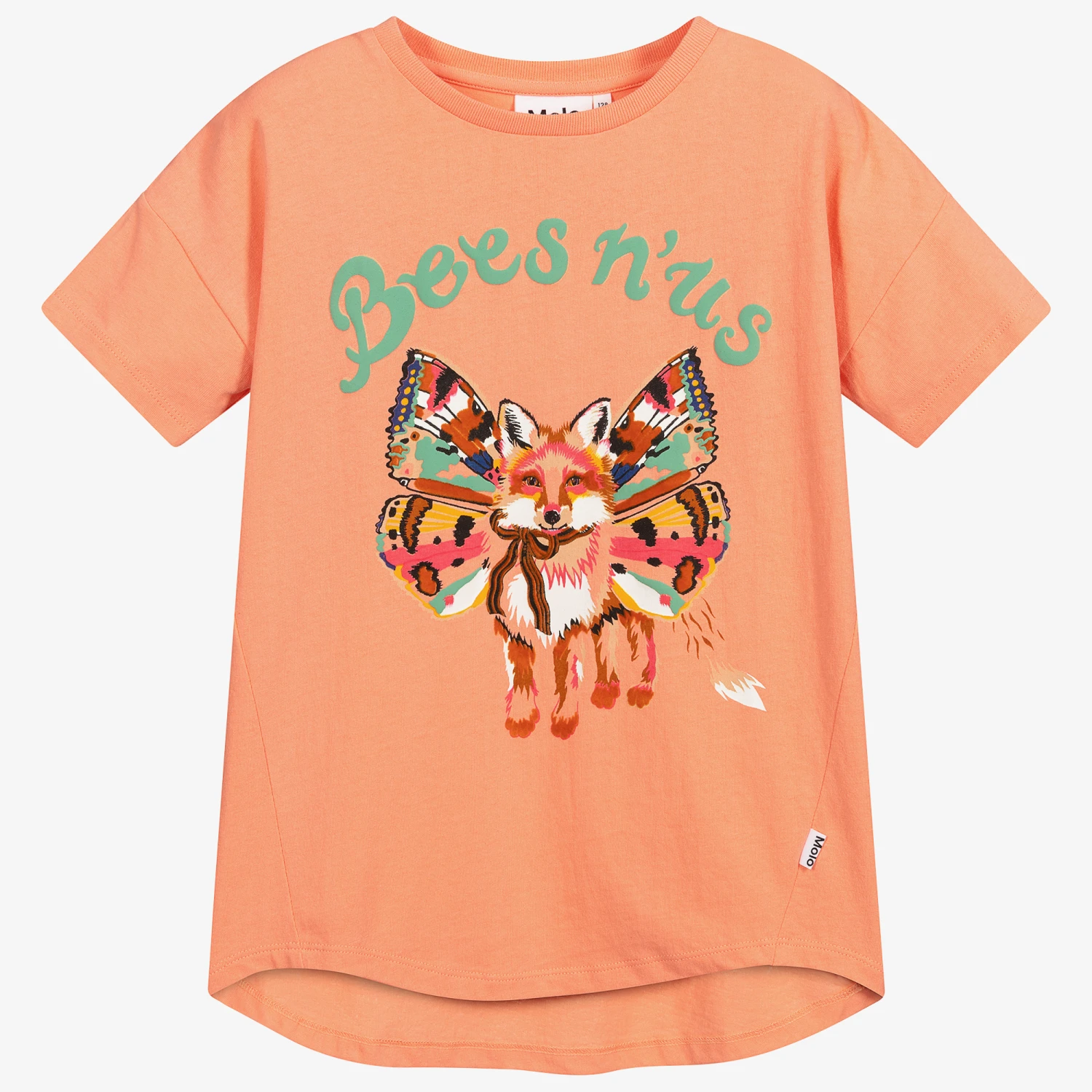 Coral pink T-shirt for girls by Molo, made in soft and stretchy cotton jersey. It has a fun fox print with colourful butterfly wings, and ‘Bees n’ Us’ in aqua green above. The side seams are shaped and there is a dipped hem at the back.