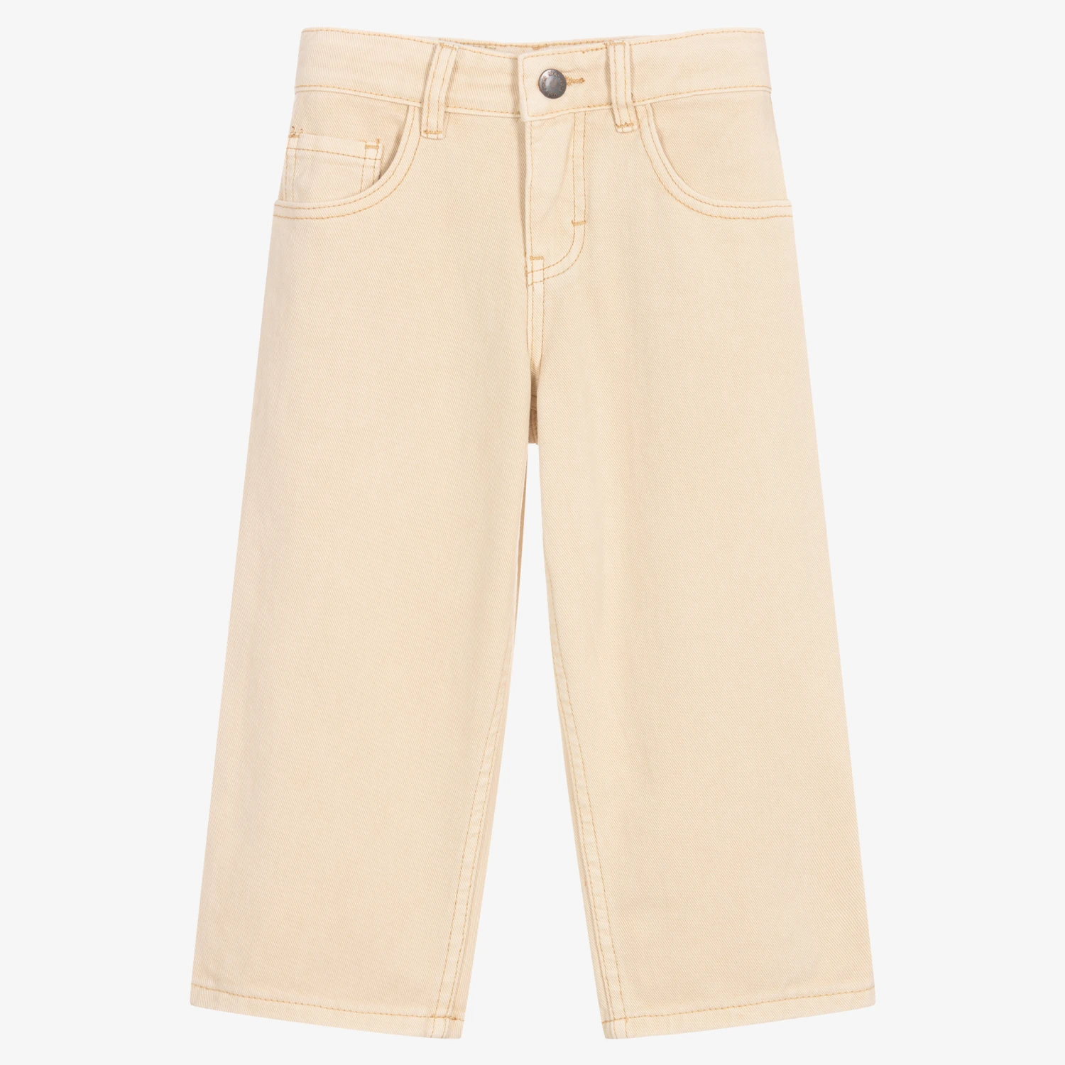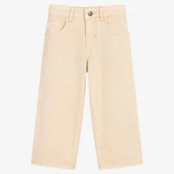 Light beige jeans for girls by Danish brand Molo, made in soft and durable organic cotton denim. Easy-to-wear and style, they have five-pocket styling, with a zip and popper closure. They come in a relaxed straight fit, featuring a logo patch and tab on the back for added coolness. There is an adjustable waistband on all sizes.