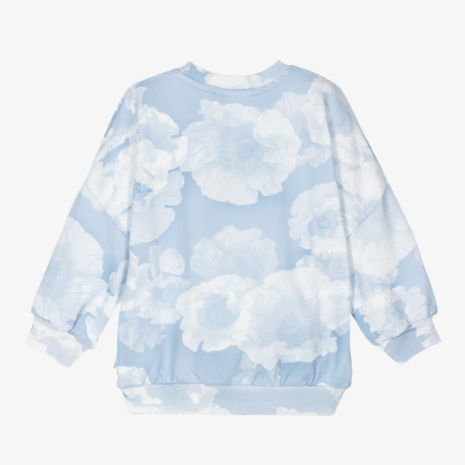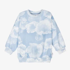 Designed by Molo, fun blue and white sweatshirt for girls. Made in soft organic cotton jersey, it has a white cloud print all-over and white rubberised logo print on the chest.