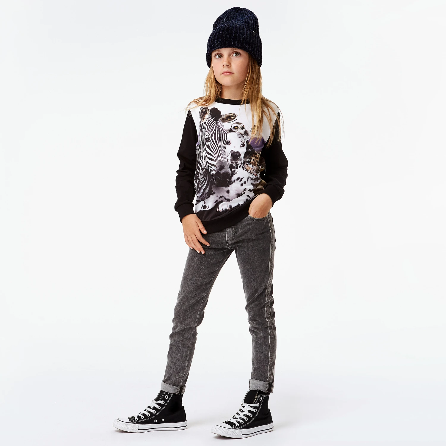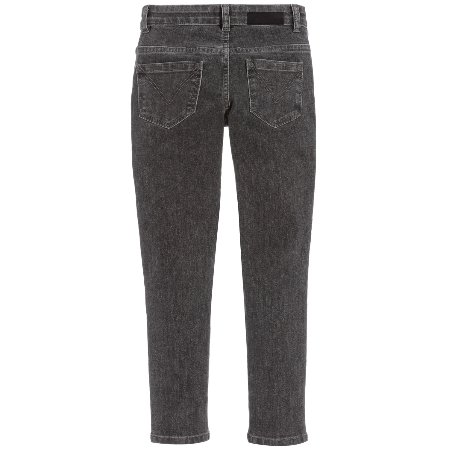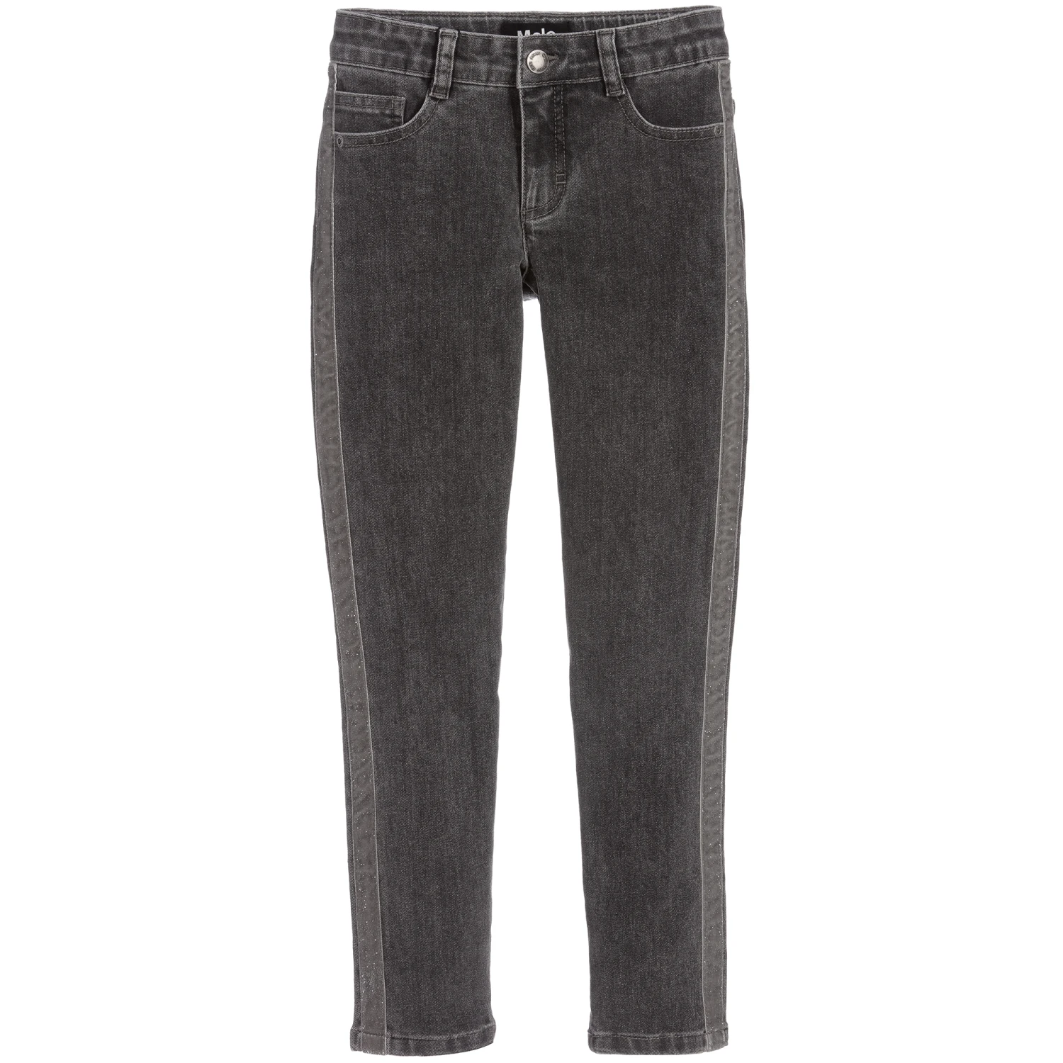 Girls grey, stretch denim jeans by Molo, with glittery velvet trim on the side seams. They have an adjustable waist, with a button and zip fastening. In a slim-fit style, they have a worn and faded look.