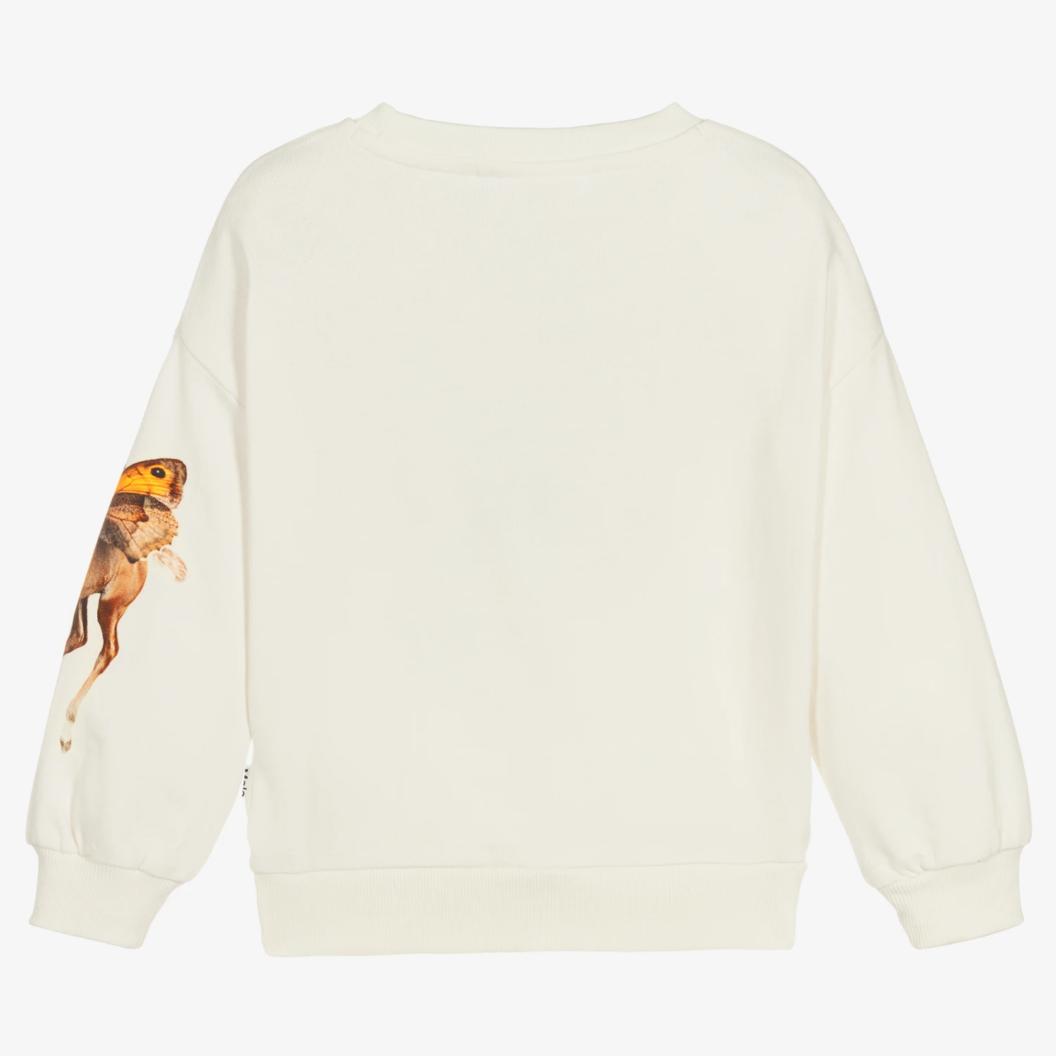 Ivory crew neck sweatshirt for girls by Danish brand Molo. Made in soft organic cotton jersey, it has a beautiful winged horse print on the front for a nature-inspired look, and stretchy ribbed trims.