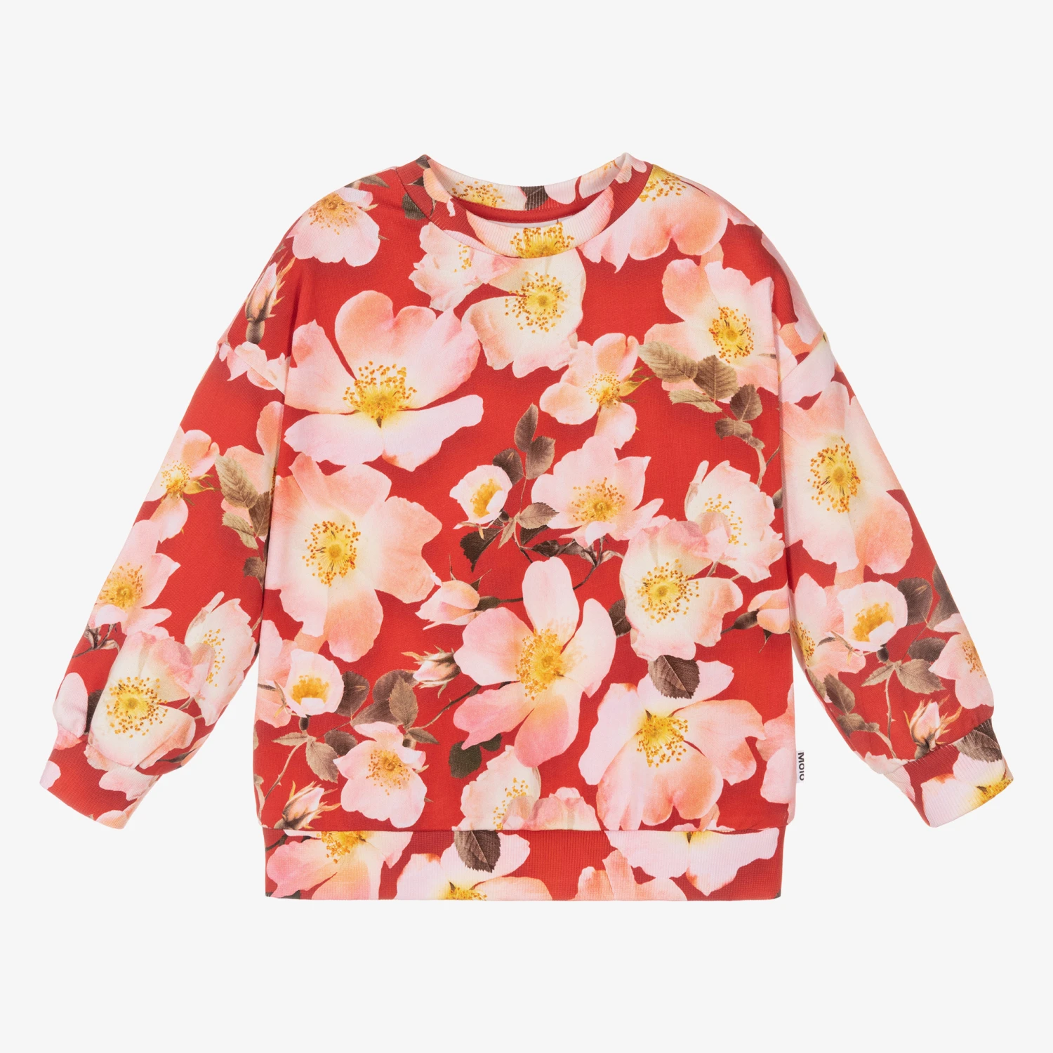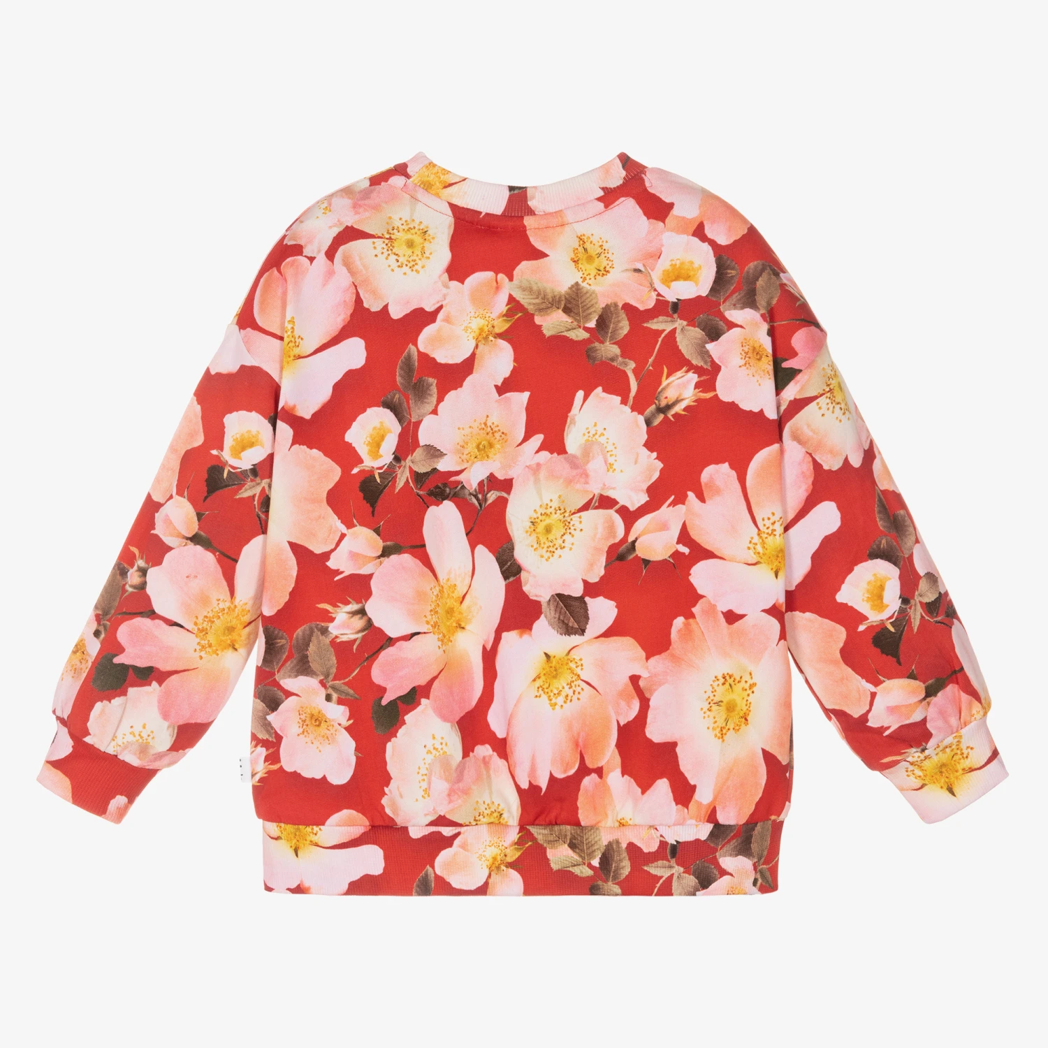 Red organic cotton sweatshirt for girls by Danish brand Molo, made with soft and stretchy sweatshirt jersey. There is lovely pink and yellow rose print.