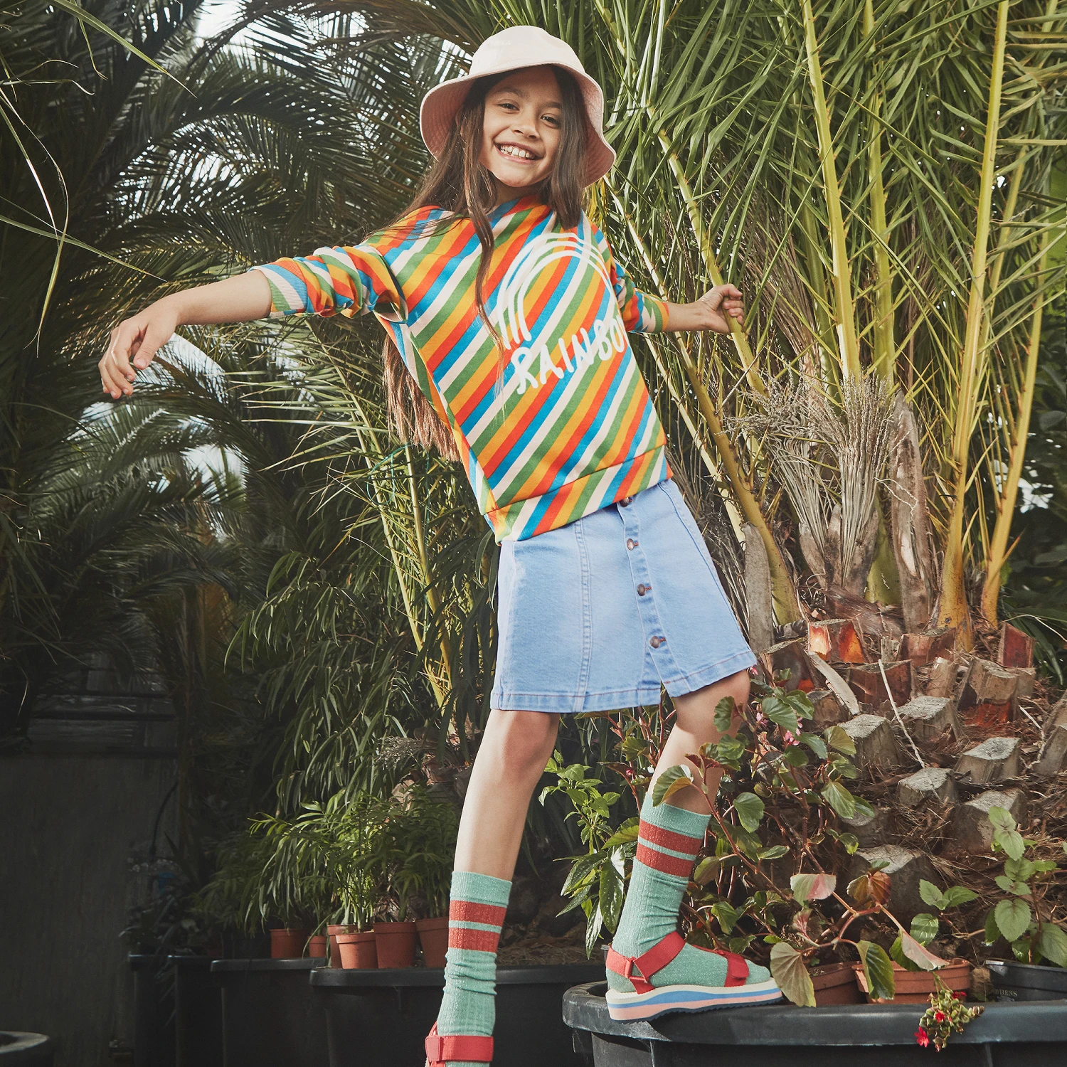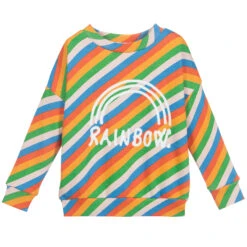 Colourful striped sweatshirt for girls by Molo, made in a soft and stretchy cotton and viscose jersey blend. It has a white rainbow print on the front.